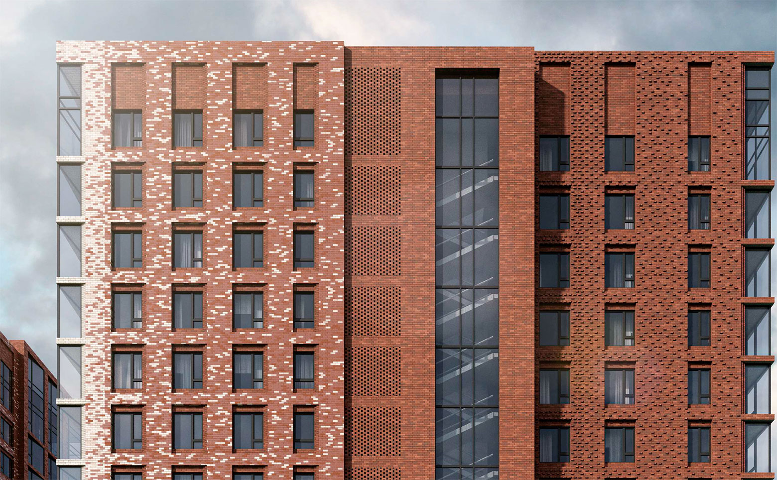 Жилой комплекс состоит из 3 кирпично-монолитных домов высотой от 22 до 23 этажей. Архитектура зданий выделяется облицовкой в виде градиентной кирпичной кладки и панорамной входной группой. В основе объектов — прочные конструктивные решения: монолитный каркас и облицовочный кирпич, которые обеспечивают хорошую шумоизоляцию и теплоэффективность.