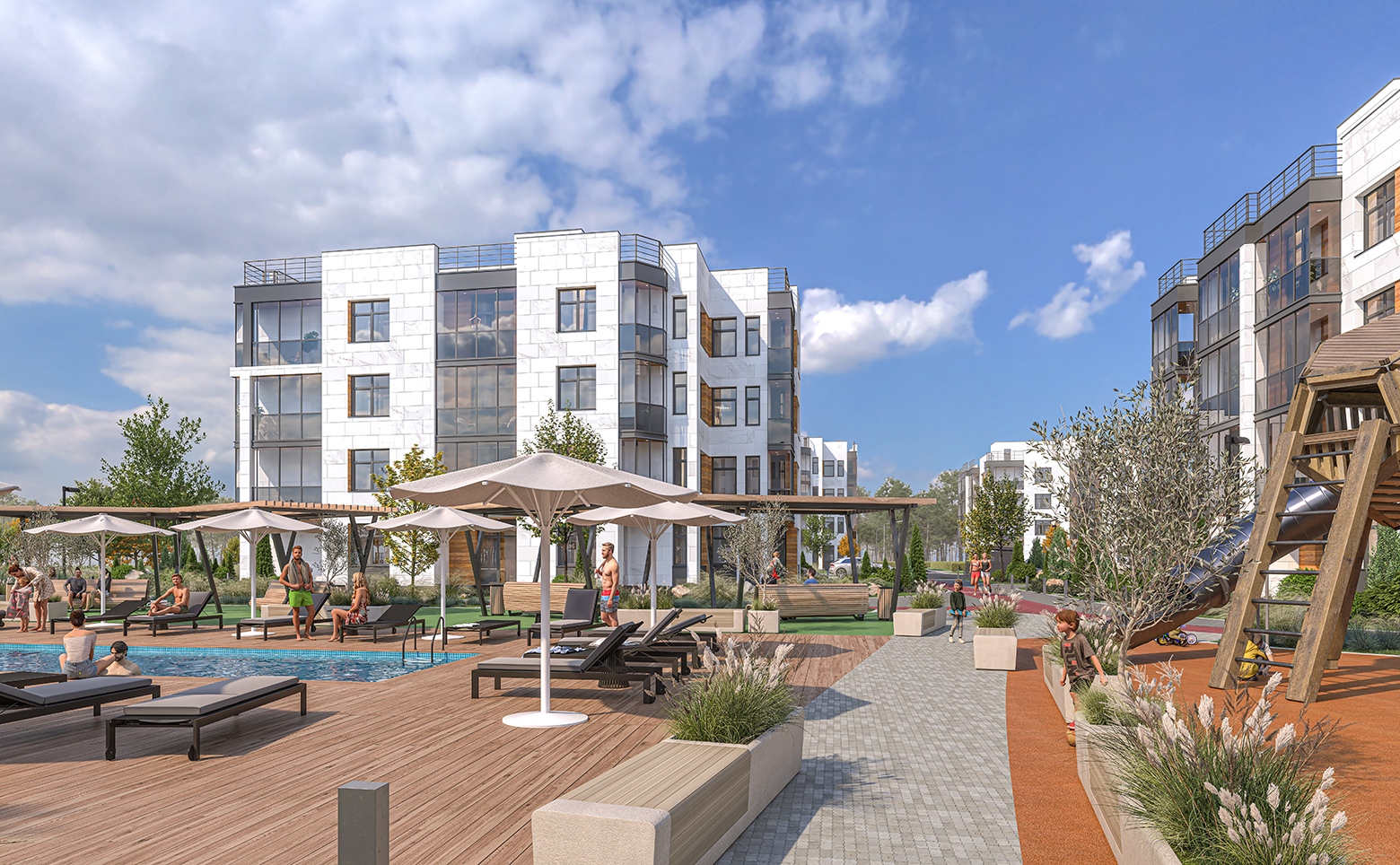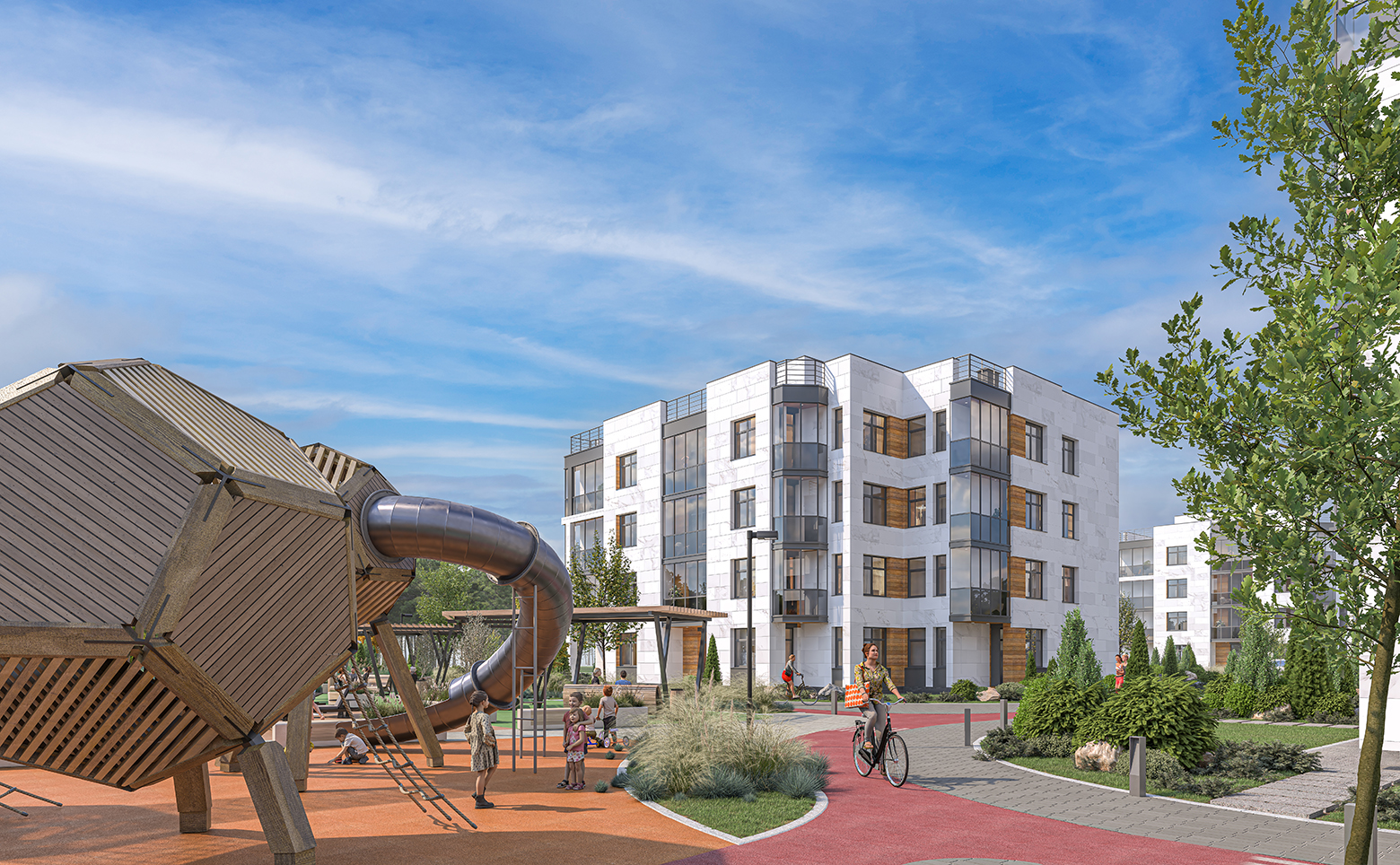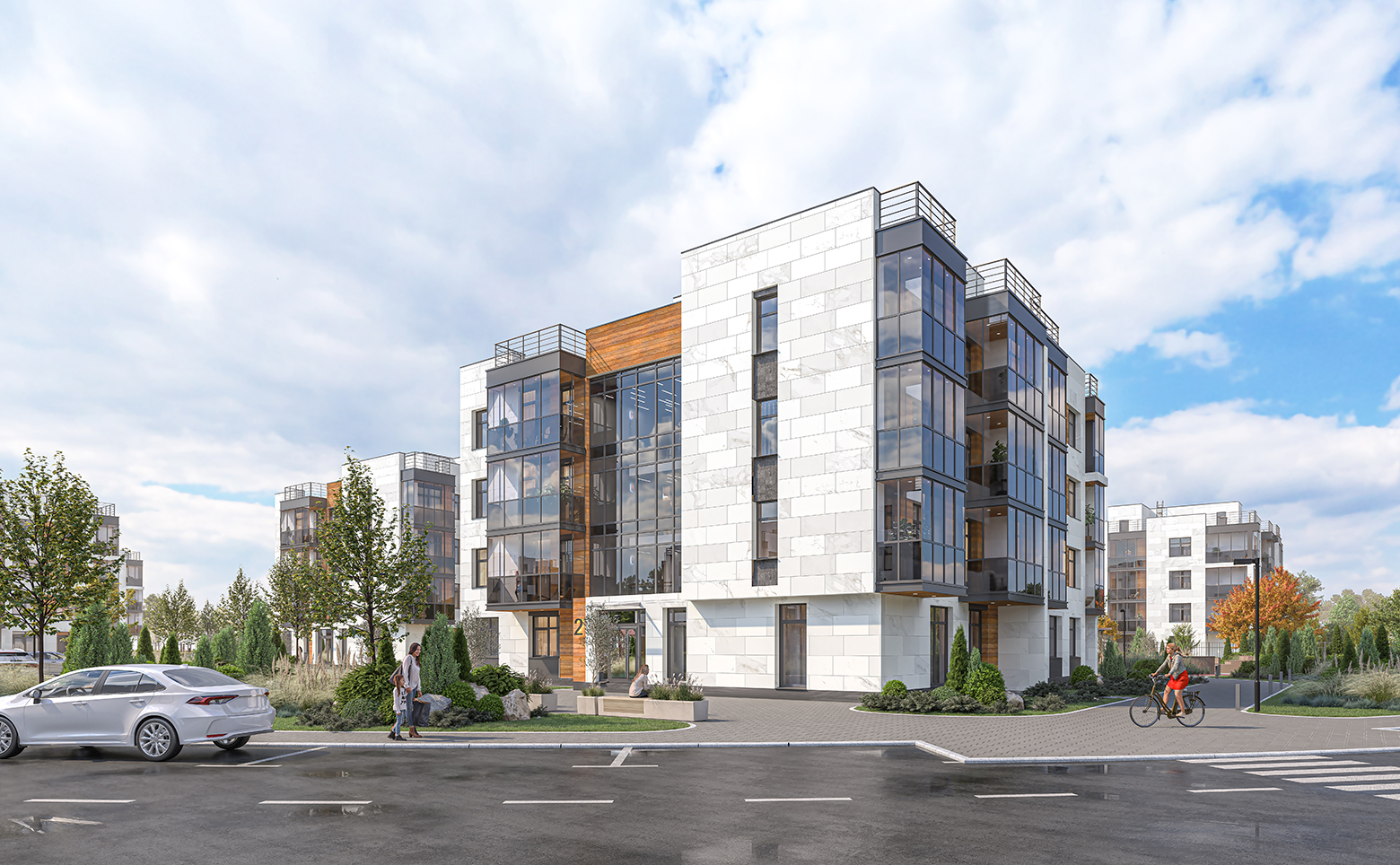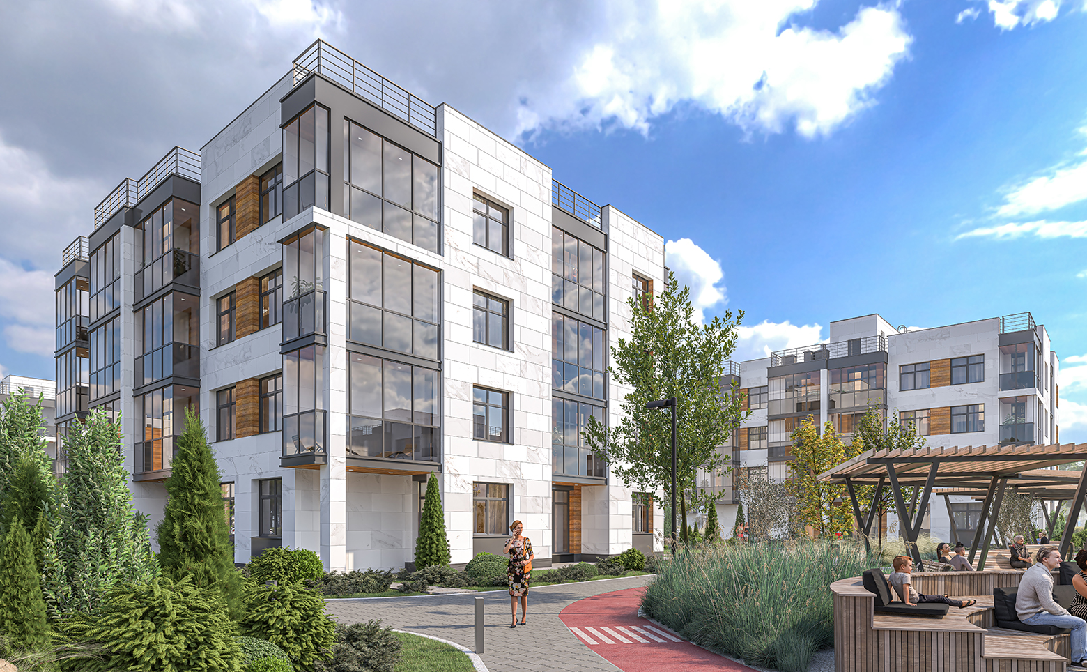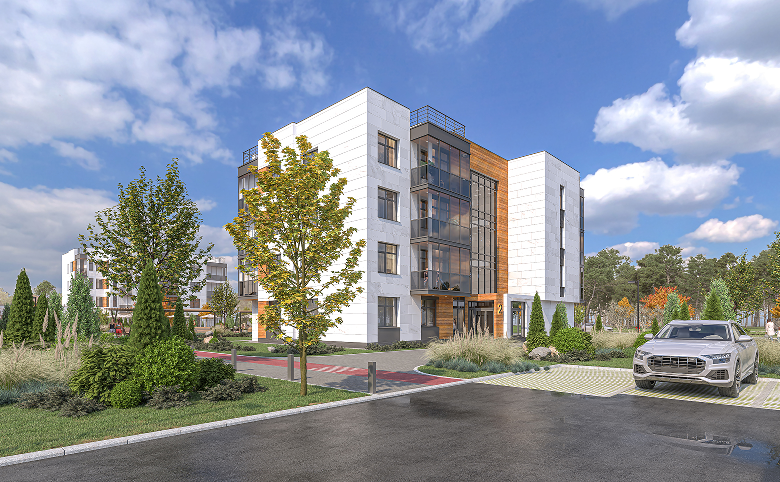 Жилой комплекс представлен 4-этажными зданиями, выполненными по монолитной технологии с комбинированными фасадами. В архитектуре использованы лаконичные формы и натуральные материалы, фасады интегрированы в природное окружение. В доме предусмотрен грузовой лифт, лифтовые шахты не примыкают к квартирам. Лобби выполнены с применением натуральных материалов, спокойной цветовой гаммы и продуманного освещения.