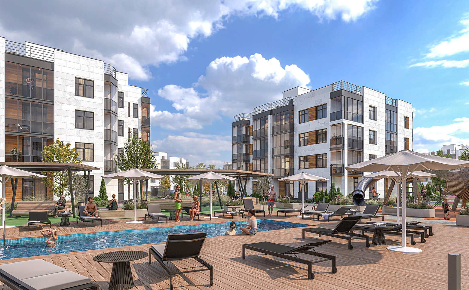 Территория комплекса закрыта от посторонних. Для жителей предусмотрены бассейн с подогревом, коворкинг, детский развивающий центр, спортивный зал, детская и спортивная площадки, а также вертолетная площадка. Владельцам авто доступна открытая стоянка.