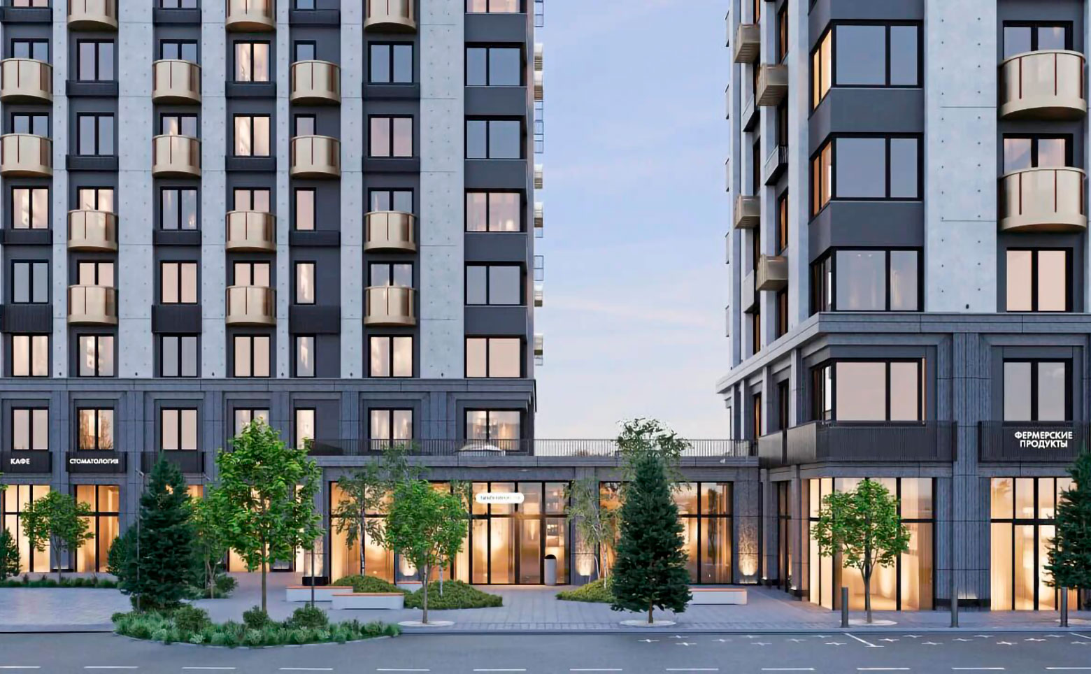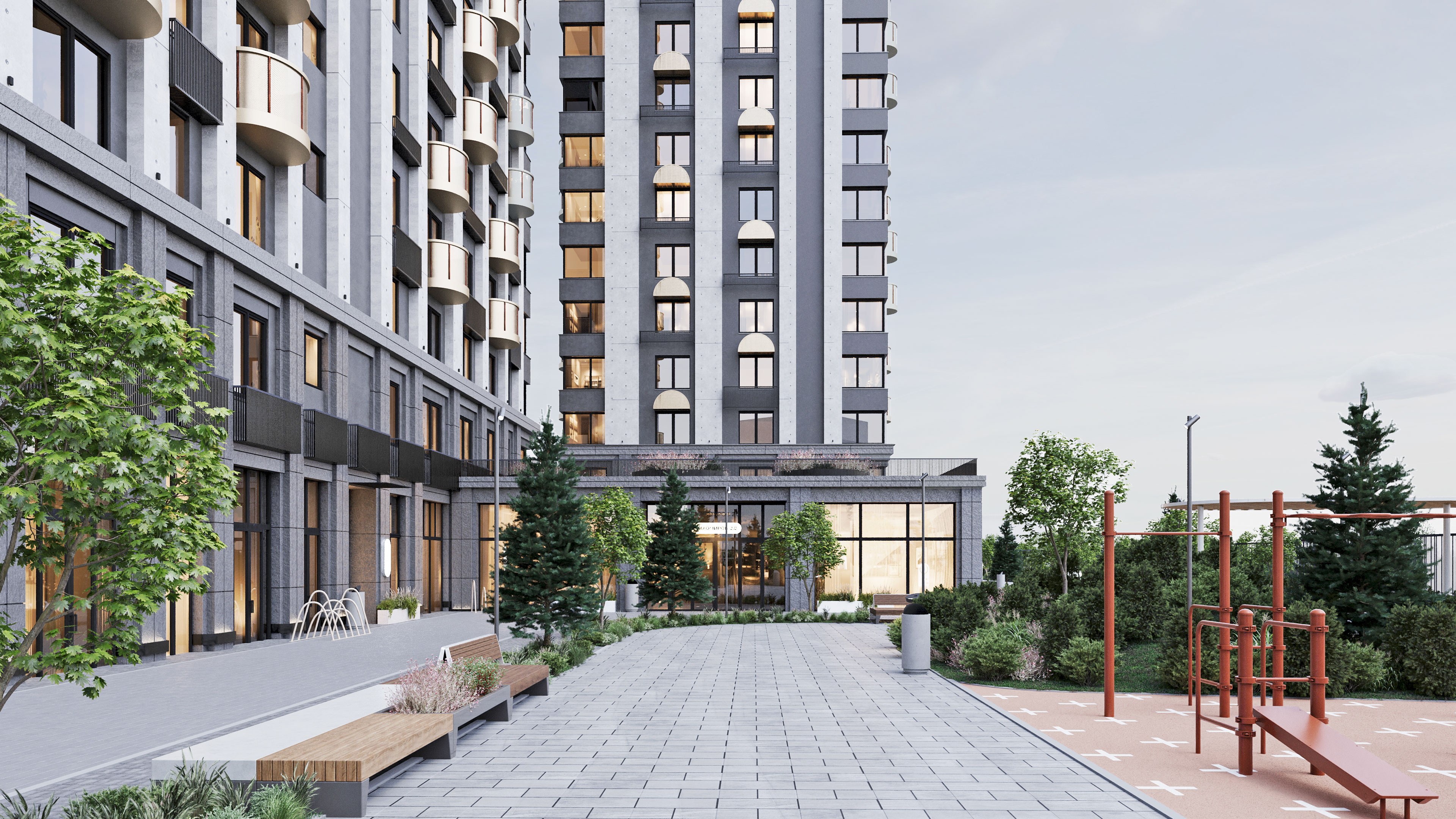 Территория комплекса благоустроена: имеется ресепшен-сервис гостиничного уровня, соседский досуговый центр, собственный кинотеатр, фитнес пространство с зоной кардио, йоги и силовых нагрузок, детская площадка для разных возрастов, домашний офис с оборудованными переговорными комнатами, территория для питомцев, велопарковки с навесом. Для автовладельцев предусмотрен подземный паркинг с местами для мотоциклов, зарядными устройствами для электротранспорта.