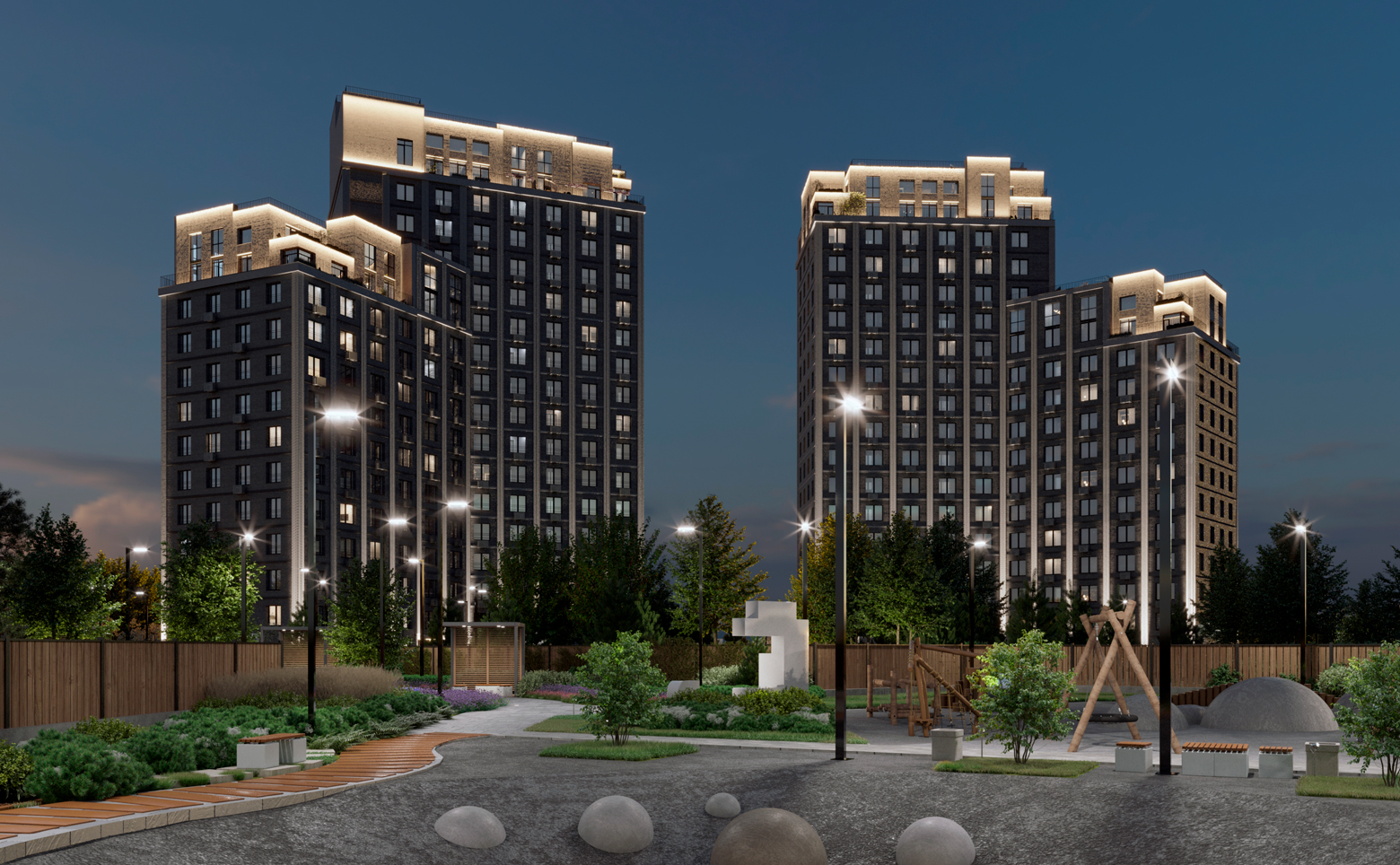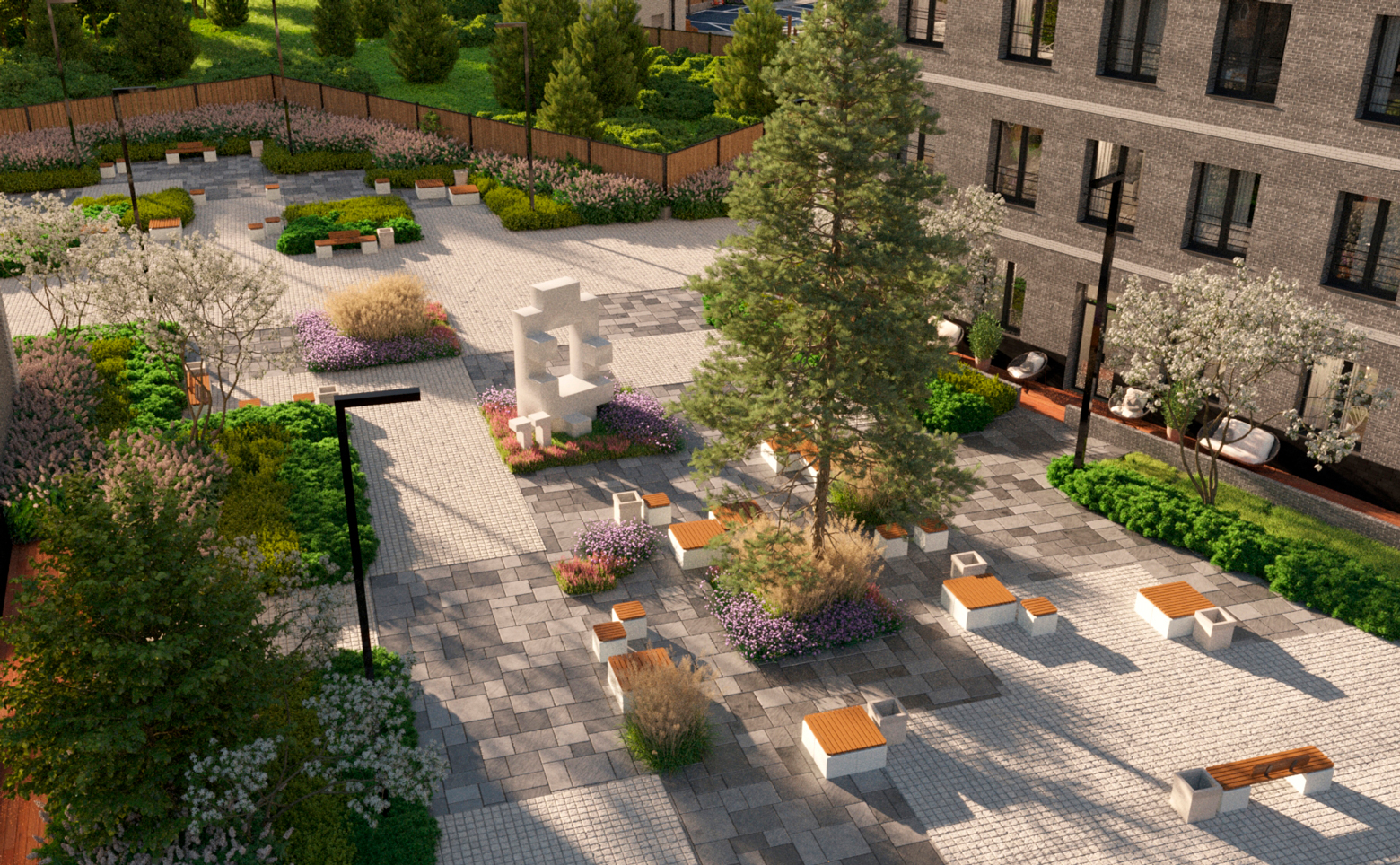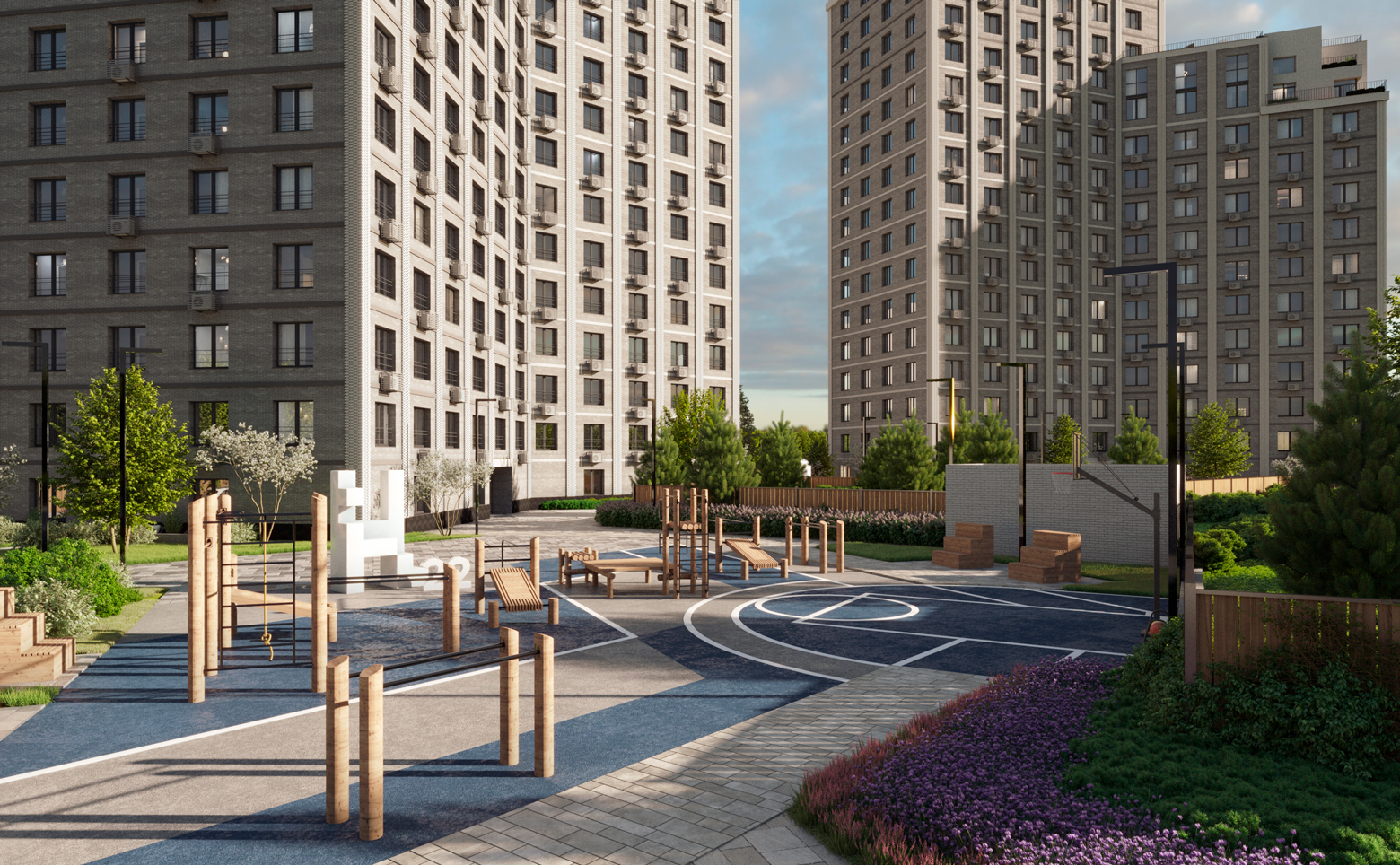 На дворовой территории проекта расположено 5 детских площадок, зона спорта с мини-трибунами, места для общения и отдыха с беседками и зеленью. Для владельцев автомобилей предусмотрены наземный и подземный паркинги.