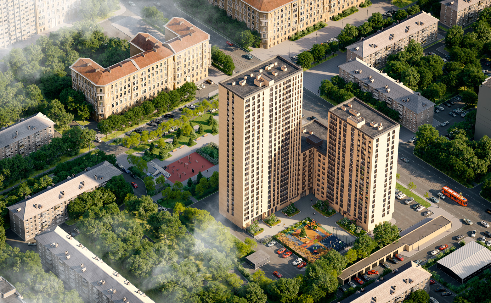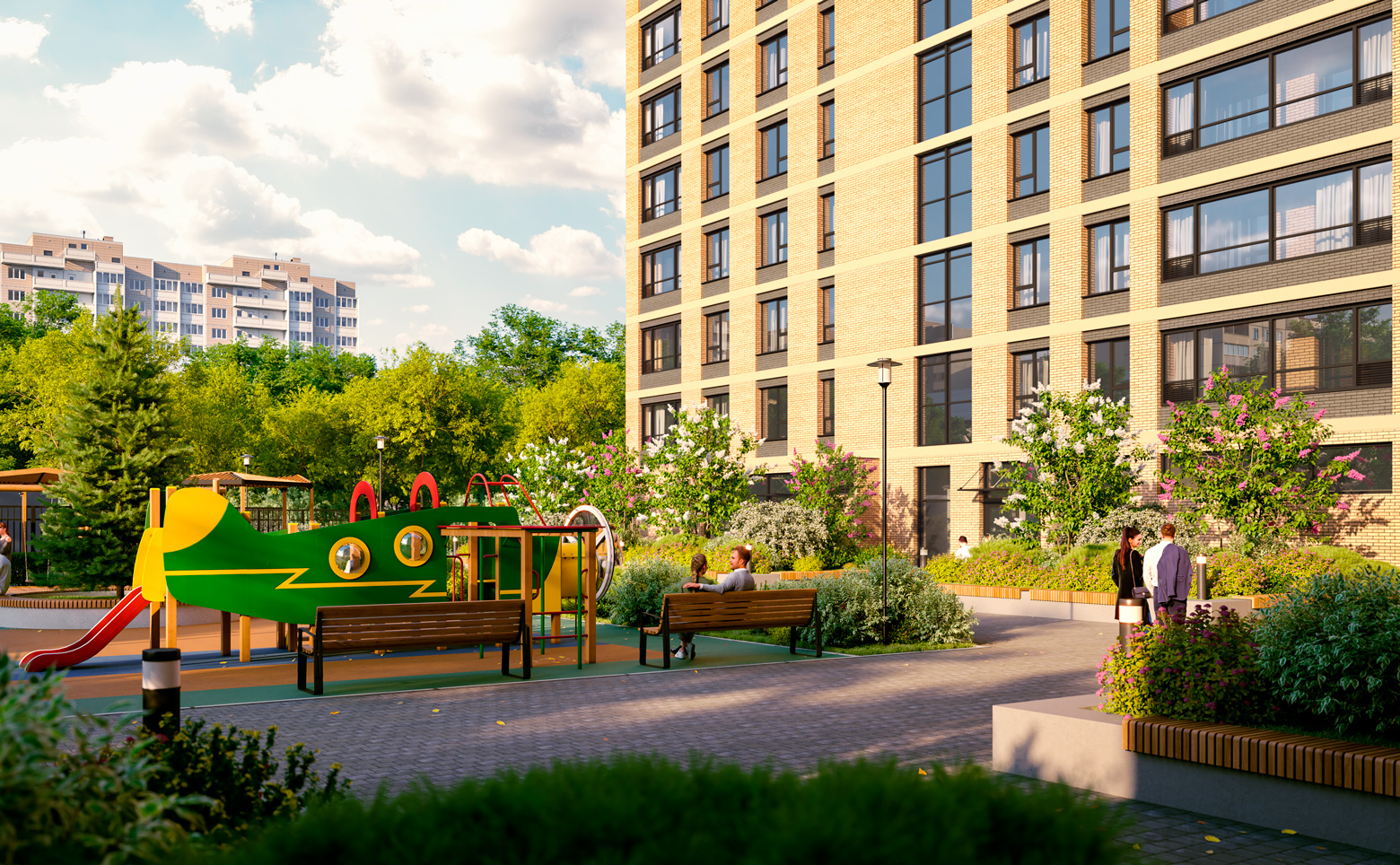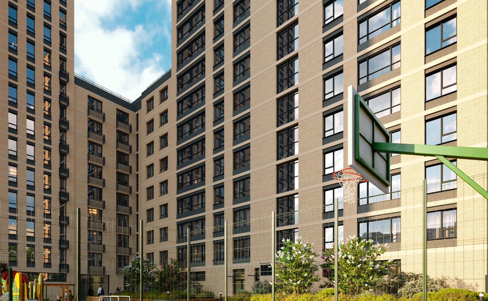 В жилом комплексе выполнены ландшафтный дизайн и умное зонирование двора, где расположены детские площадки, территория спорта с тренажерами, игровые комплексы и зоны для отдыха. Для удобства и безопасности на площадках предусмотрено резиновое покрытие. Закрытая территория и концепция двор без машин — является дополнительным преимуществом ЖК. Для автомобилей предусмотрен подземный паркинг на 201 место. Доступ посторонних лиц и случайных автомобилей исключен — управление воротами и шлагбаумами осуществляется брелоками-датчиками владельцев парковочных мест. Спуститься в паркинг можно на лифте в любой из 3 секций.