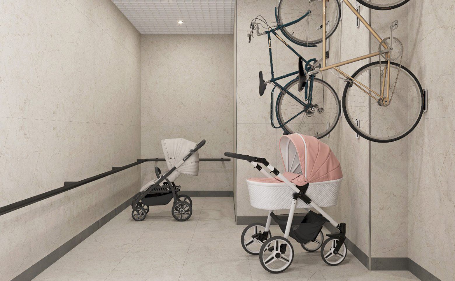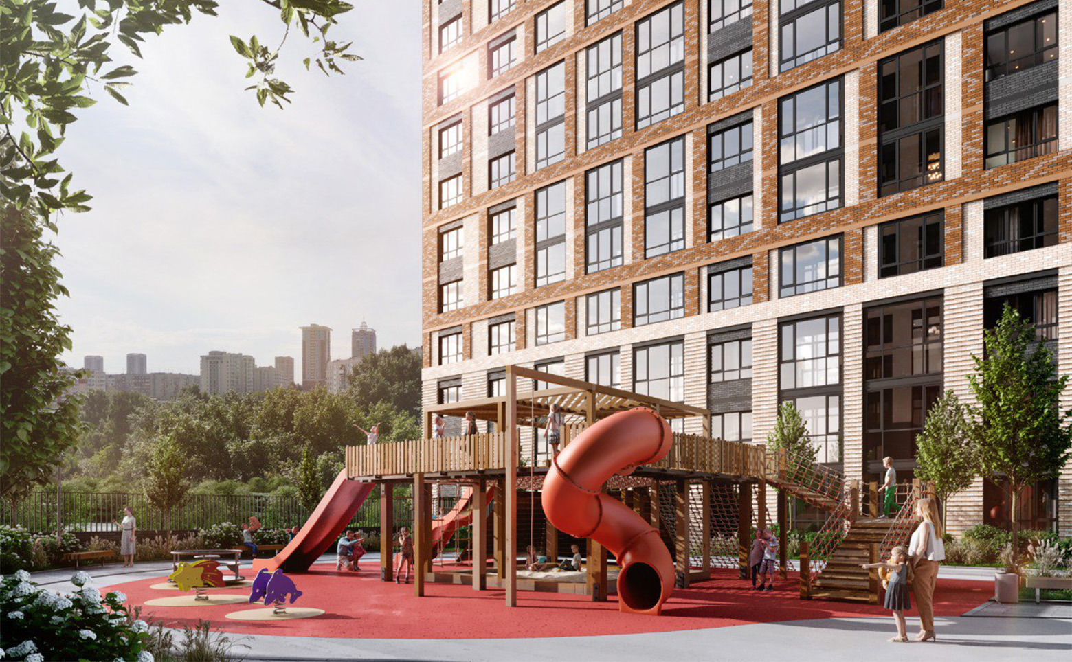 Внутренняя территория проекта огорожена и разделена ландшафтным озеленением с учетом сезонности. Предусмотрены места для отдыха и игровой гранд-комплекс для детей. На первых этажах домов располагается коммерческая инфраструктура. Для владельцев автомобилей предусмотрены стоянка и подземный паркинг.