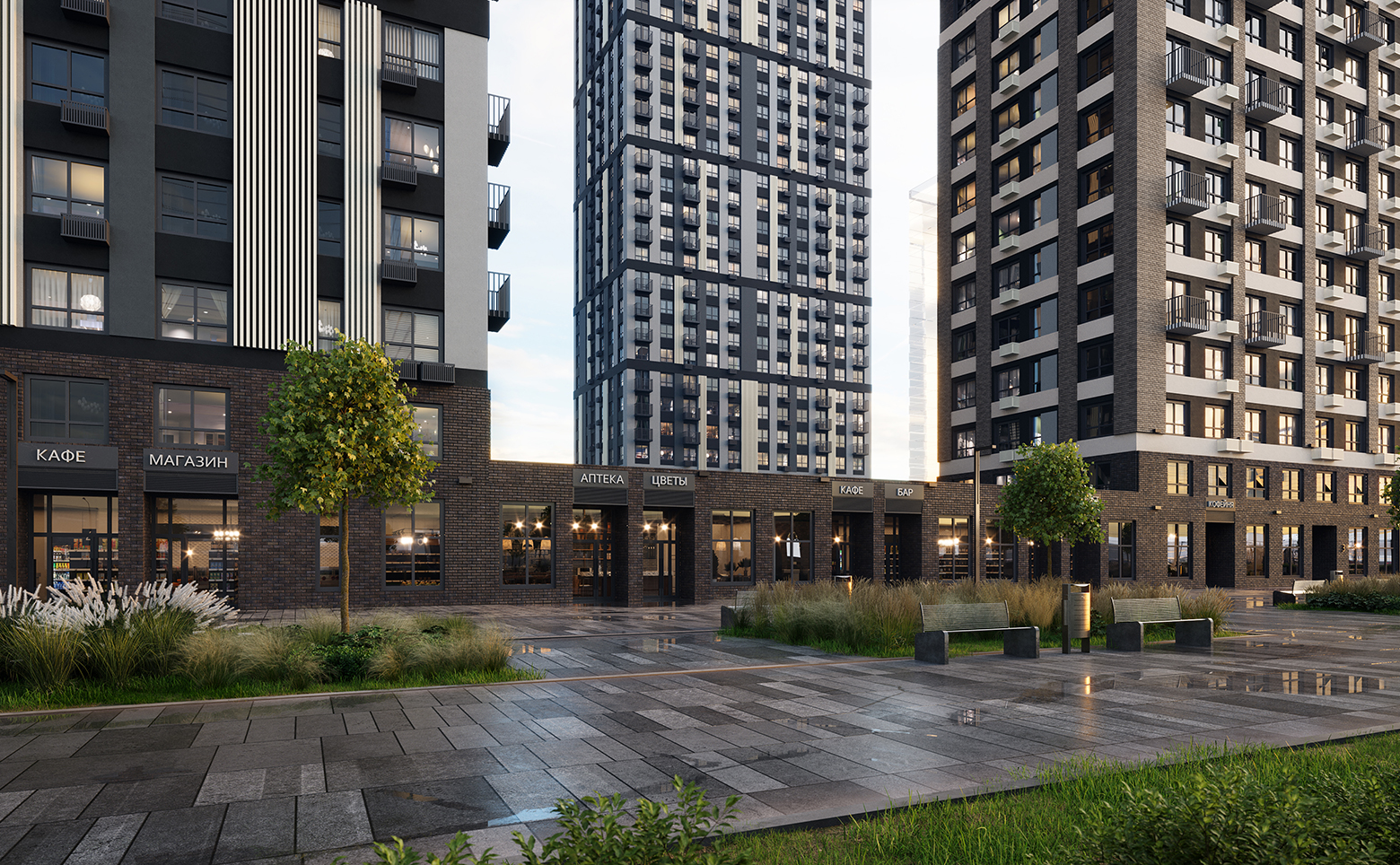 Внутренний двор имеет 2 уровня благоустройства. Обустроены прогулочный бульвар, зоны отдыха в собственном дворе, детские площадки для детей разных возрастов, спортивные площадки, скамейки и перголы с подсветкой. У жилого комплекса собственная управляющая компания.