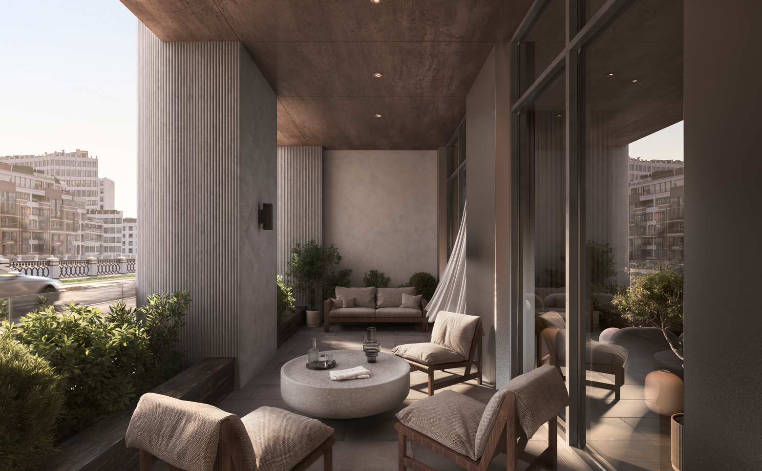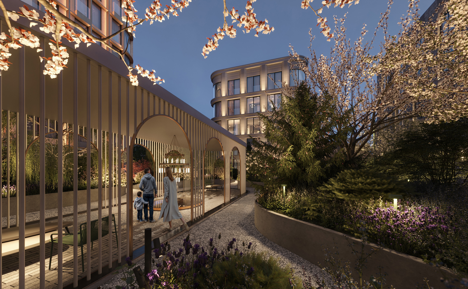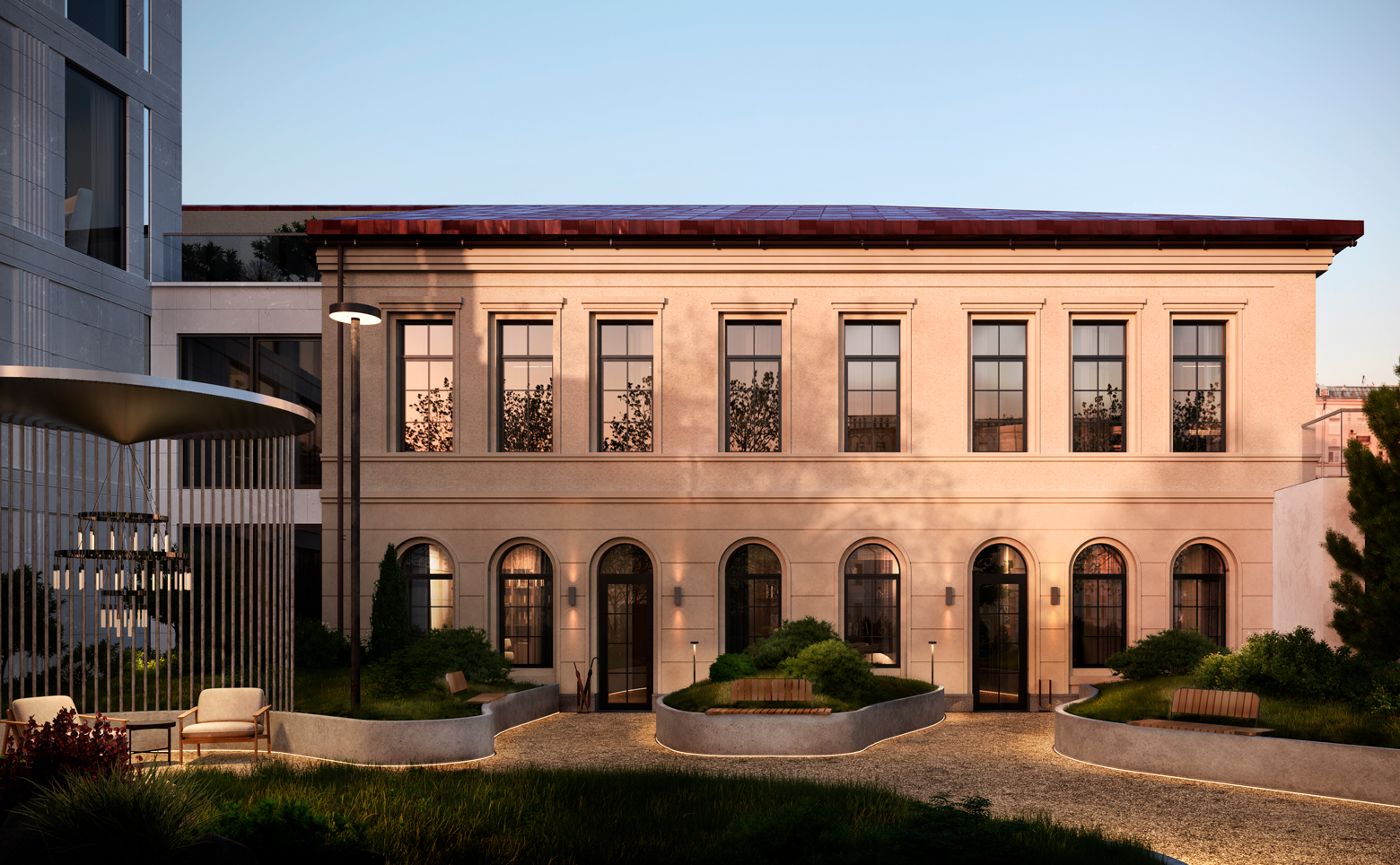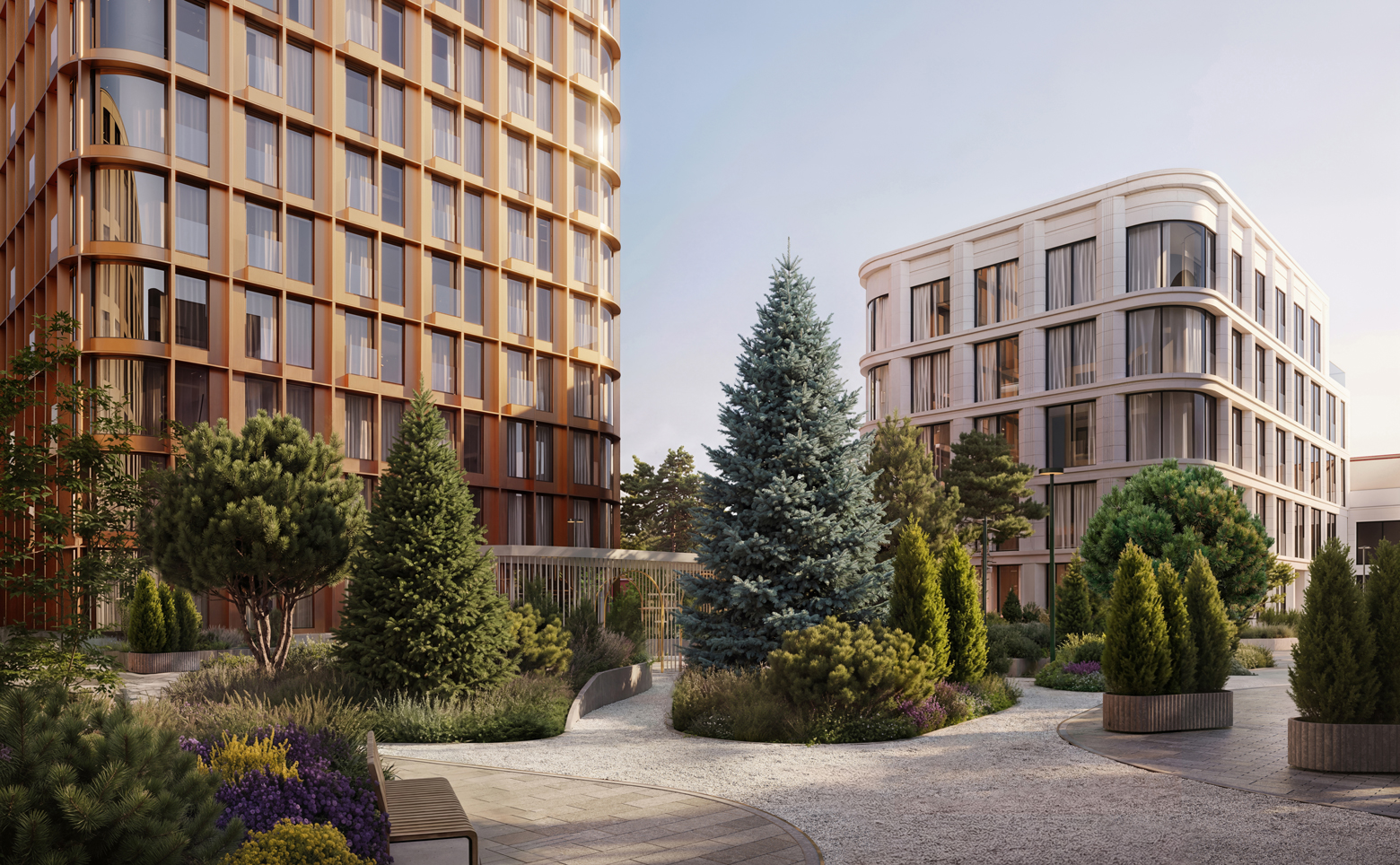 В проекте создана камерная внутренняя среда с мягким освещением и благоустроенным садом с гипоаллергенными растениями. Предусмотрено многофункциональное детское пространство. В первом корпусе расположены зимний сад, лобби с баром и камином, переговорные комнаты, клубный зал и репетиторские. Для жителей оборудованы фитнес-зал, бассейн, массажный кабинет, хаммам и русская баня. На подземном уровне размещен паркинг с комнатой для водителей. Территория комплекса полностью закрыта и находится под круглосуточным видеонаблюдением. Вход в корпуса осуществляется через лобби с системой контроля доступа.