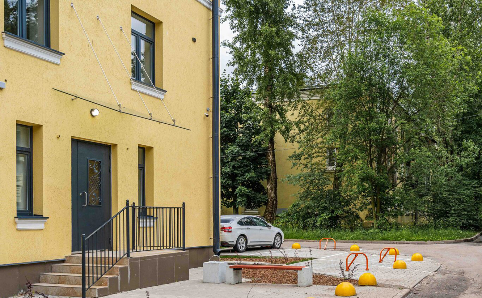 Территория комплекса благоустроена и продумана для комфортного проживания. Установлены камеры видеонаблюдения по периметру и в общих зонах, выполнено озеленение с газонами и кустарниками. Для отдыха обустроены скамейки. Также предусмотрены стоянки для авто и велопарковка, возможна установка станции быстрой зарядки для электромобилей. На первом этаже располагается коммерческое помещение.