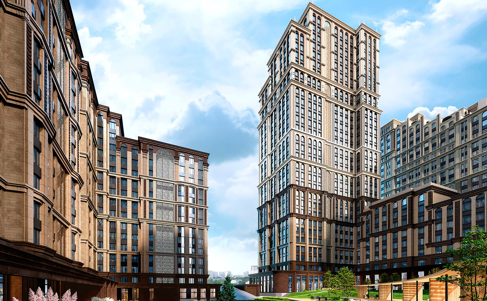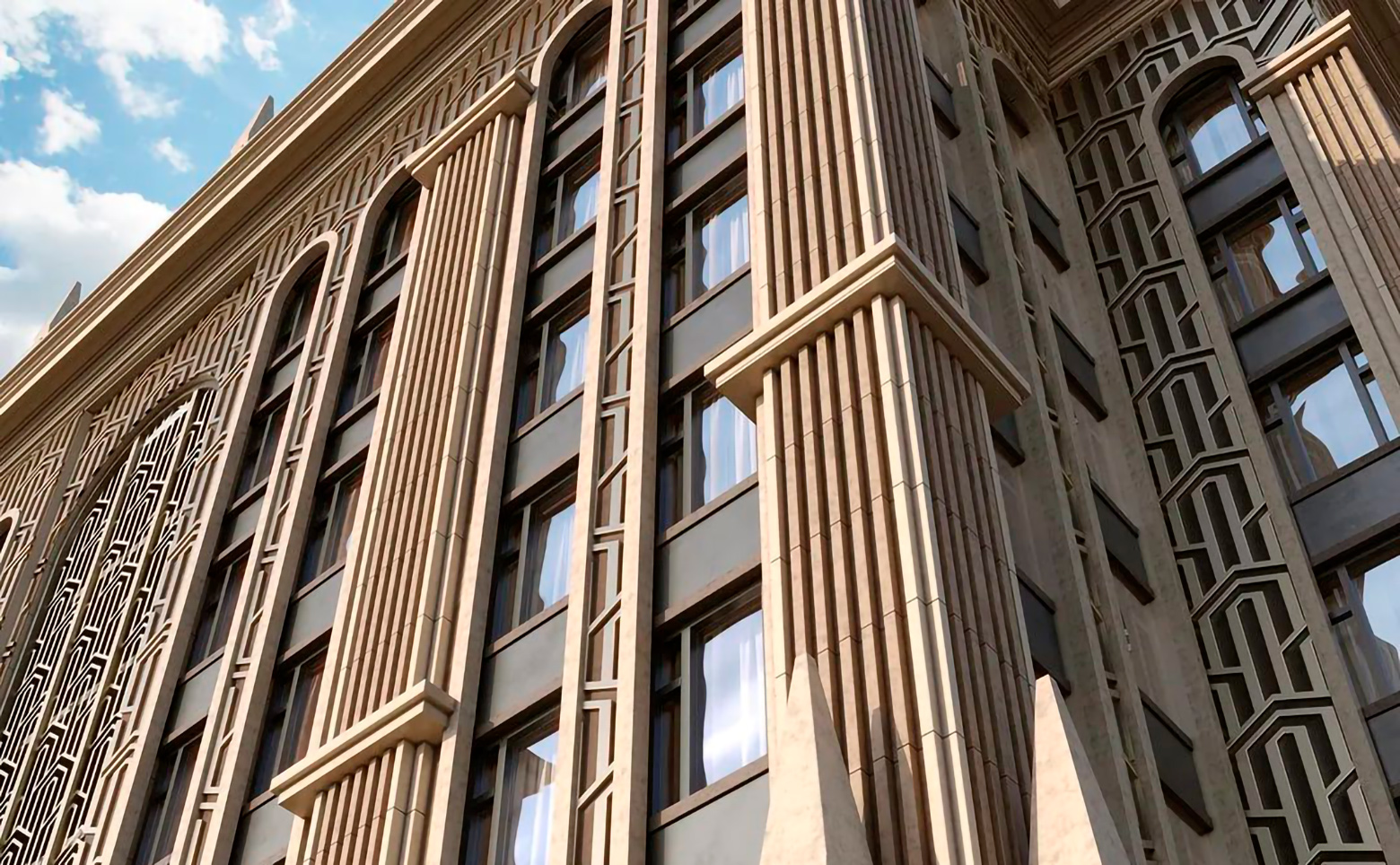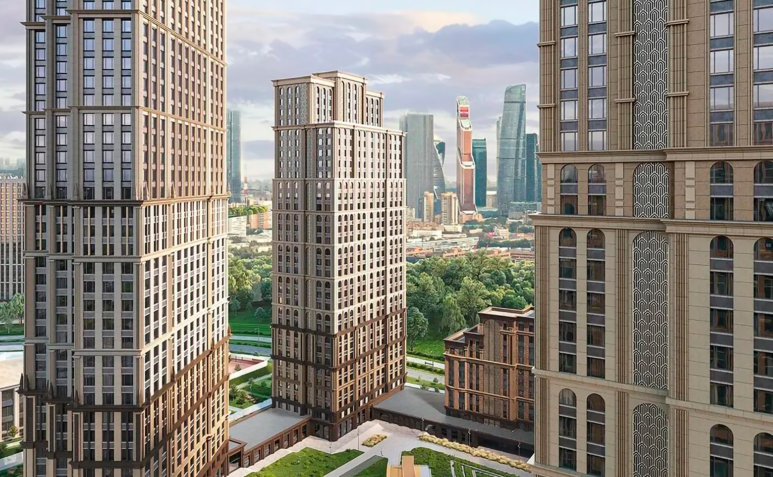 Жилой комплекс представляет собой комплексную застройку, включающую как среднеэтажные камерные корпуса, так и акцентные высотные башни. Архитектурный облик проекта в полной мере выражает глубокую философию ар-деко, в основе которой — красота, удовольствие и комфорт. Облик каждого дома деликатно продолжает традиции величественной архитектуры зданий на престижных магистралях Москвы. В рельефной пластике экстерьеров корпусов особенно эффектно выделяется арочный стиль. Входные группы и лобби оформлены с использованием премиальных материалов и дизайнерской мебели.