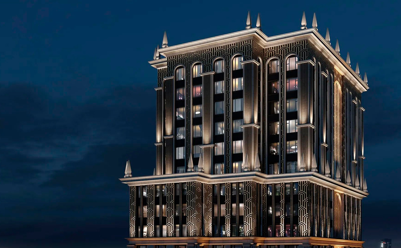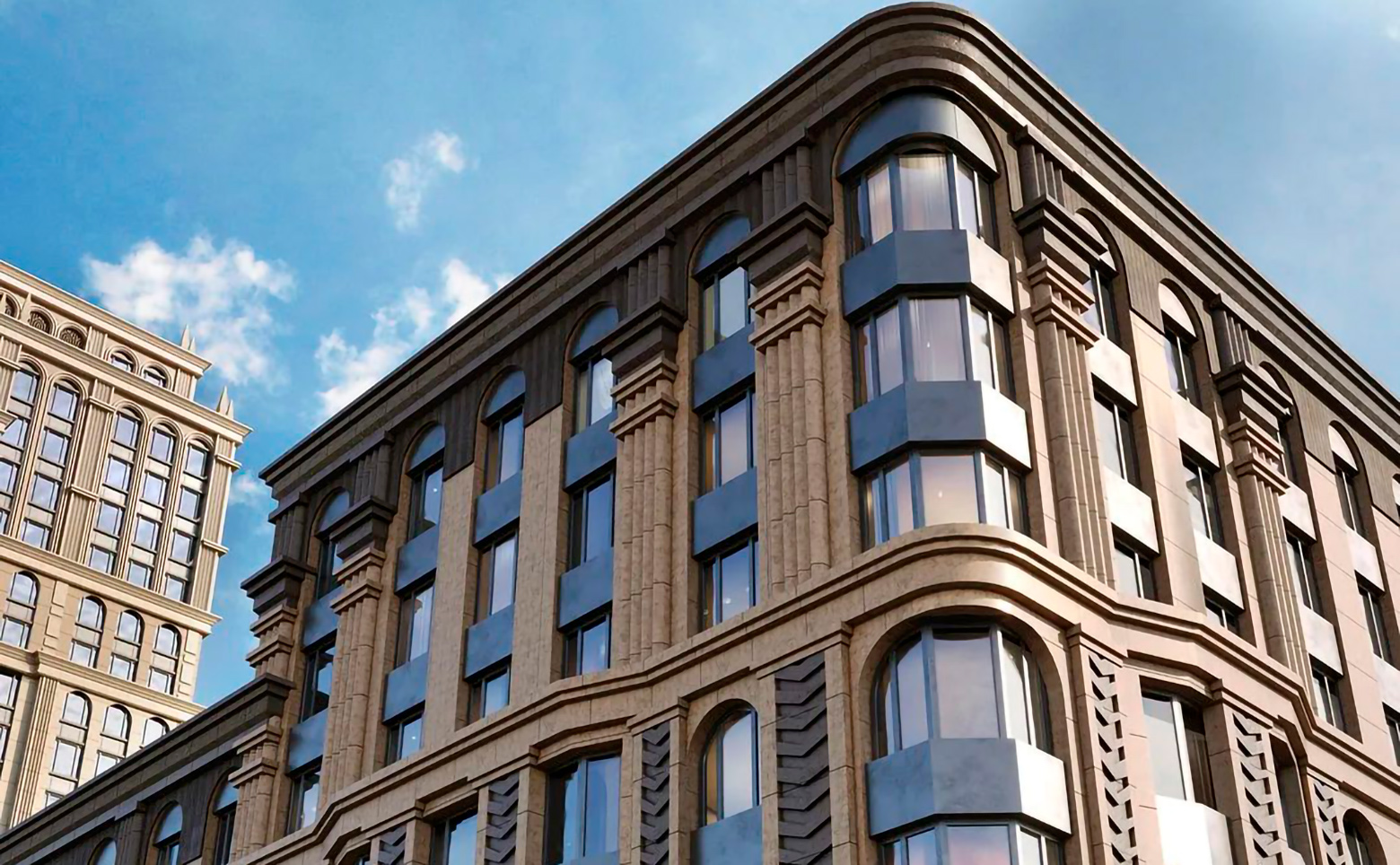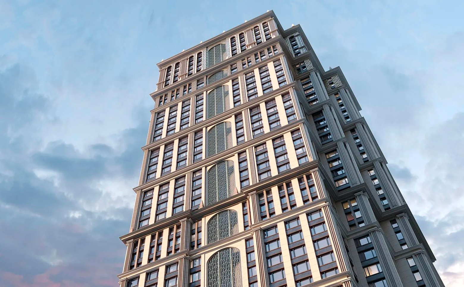 Жилой комплекс представляет собой комплексную застройку, включающую как среднеэтажные камерные корпуса, так и акцентные высотные башни. Архитектурный облик проекта в полной мере выражает глубокую философию ар-деко, в основе которой — красота, удовольствие и комфорт. Облик каждого дома деликатно продолжает традиции величественной архитектуры зданий на престижных магистралях Москвы. В рельефной пластике экстерьеров корпусов особенно эффектно выделяется арочный стиль. Входные группы и лобби оформлены с использованием премиальных материалов и дизайнерской мебели.