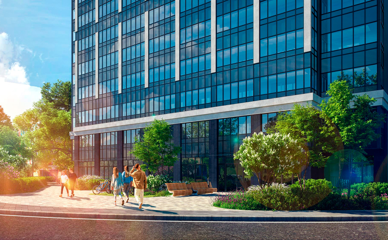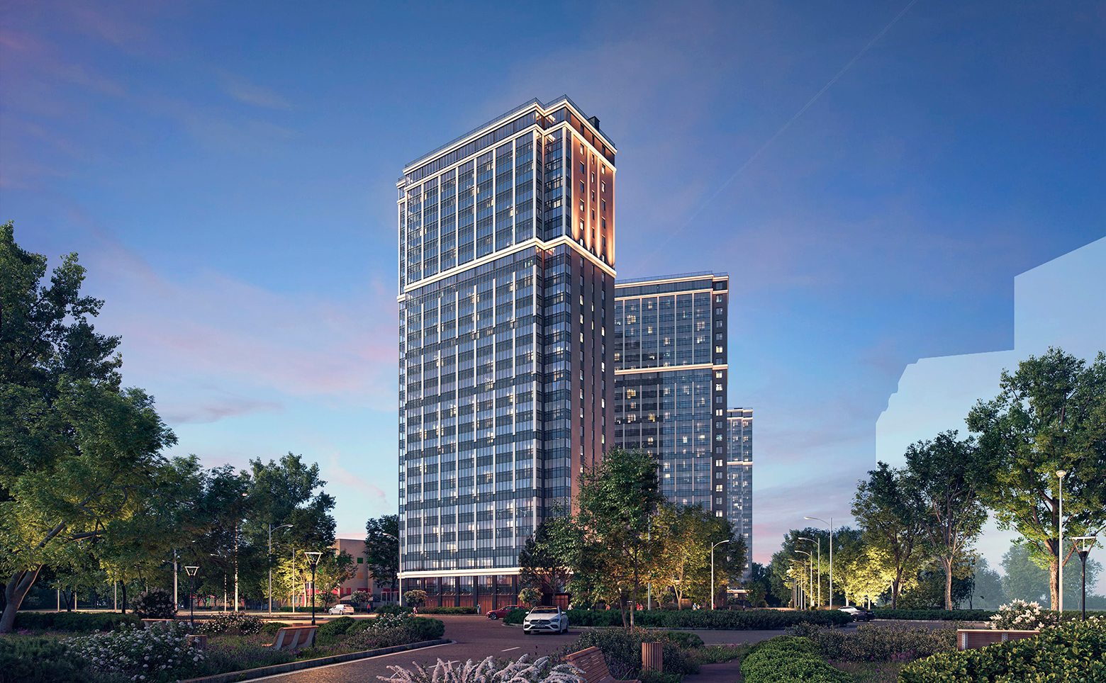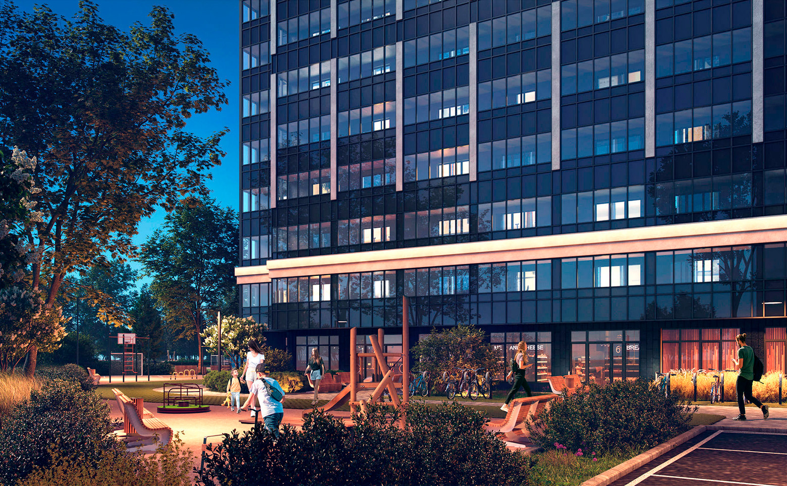 Благоустройство ЖК предусматривает круглогодичные зеленые растения и деревья. Во дворе расположены свои детский сад и школа. Для спорта и отдыха созданы специальные интерактивные пространства. Во дворе и на территории домов ведется круглосуточное видеонаблюдение. На первых этажах расположены коммерческие помещения. Для владельцев автомобилей предусмотрена стоянка. В подземной части домов находится 160 индивидуальных кладовых помещений.