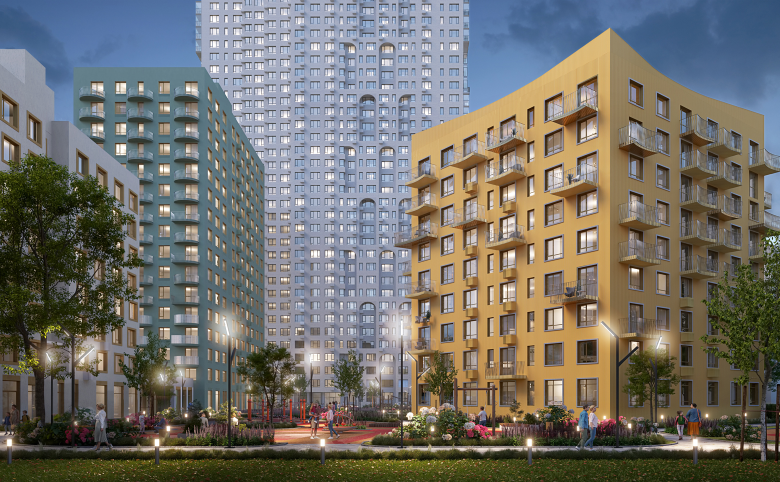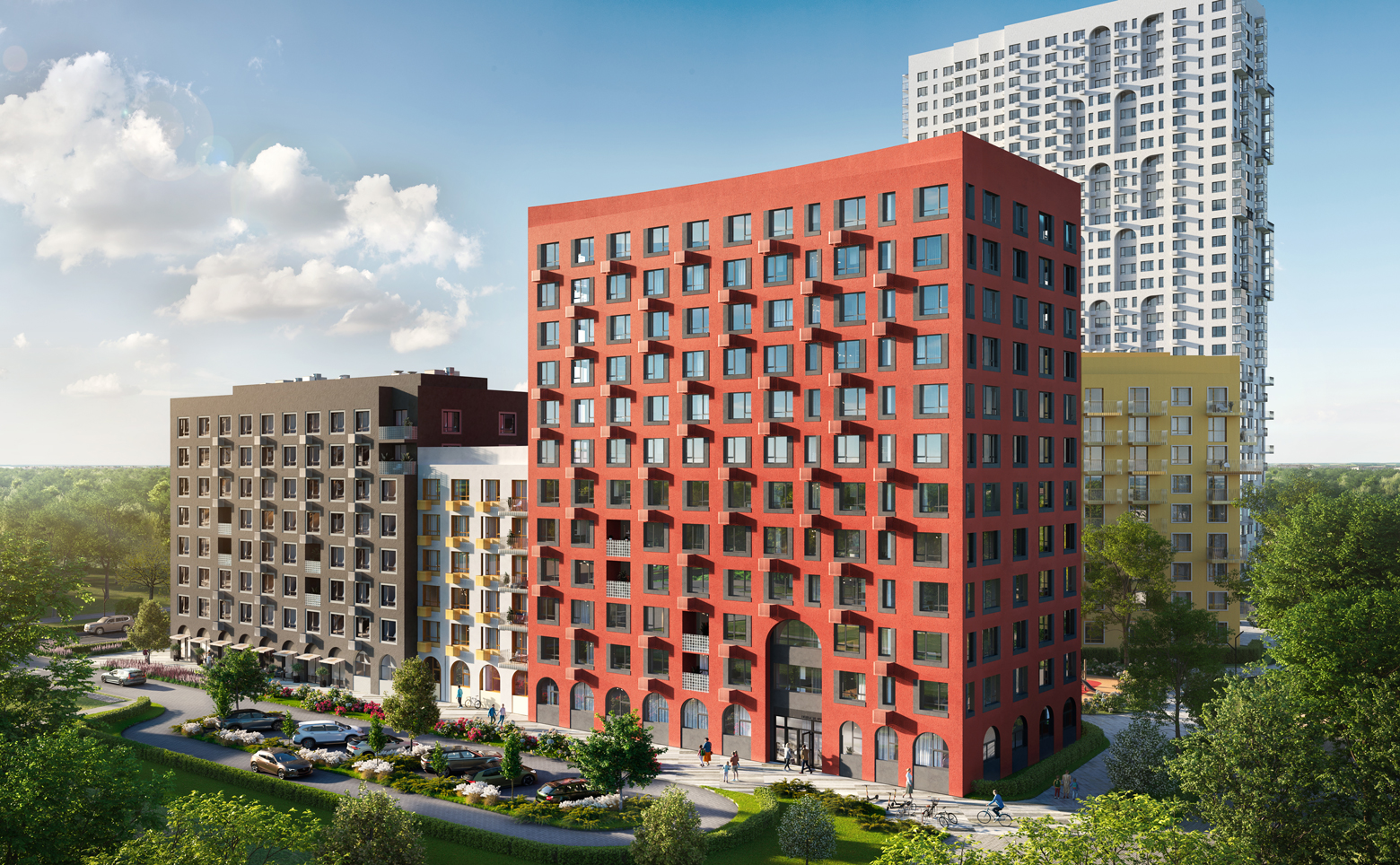 Территория комплекса организована в формате большого приватного зеленого двора без машин. Во дворе размещены спортивная площадка с воркаут-комплексами и теннисным столом, мультивозрастные детские площадки, а также лаунж-зоны для отдыха. Для владельцев авто предусмотрена стоянка.