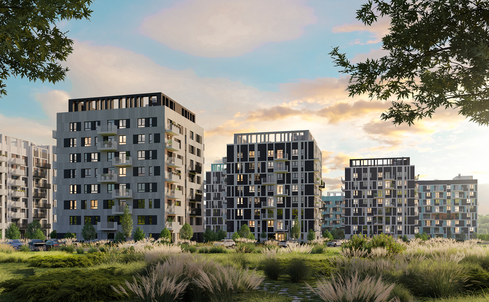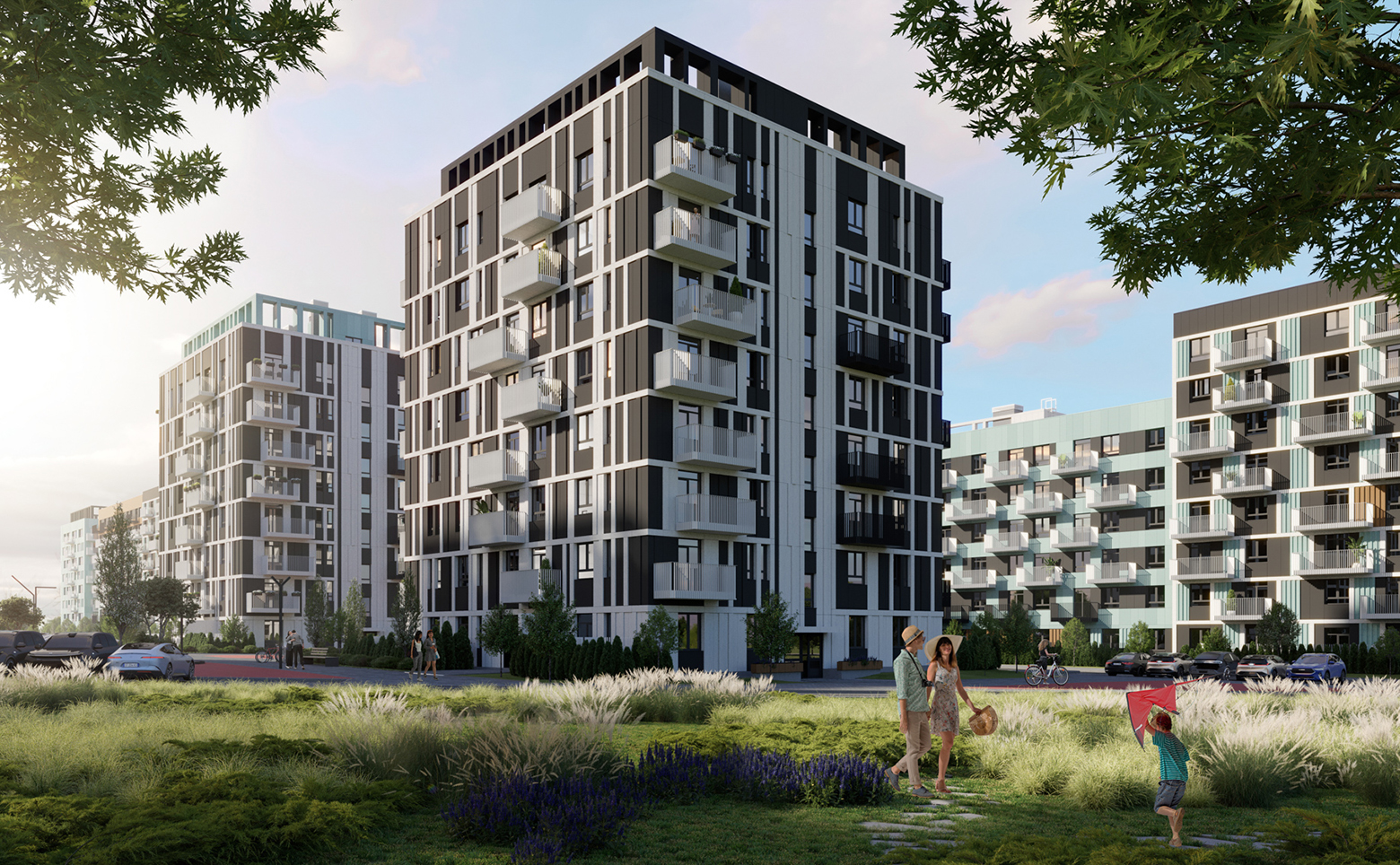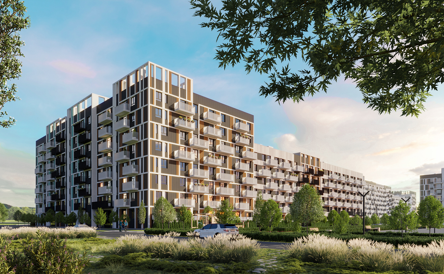 Внутреннее пространство комплекса благоустроено и свободно от автомобилей. Предусмотрены велодорожки, детские и спортивные площадки, зоны отдыха с перголами, колясочные и тактильные тропы для прогулок. Придомовая территория освещена, установлены зарядные станции для электромобилей. Для жителей обустроены грядки добрососедства для выращивания растений. Средняя этажность и отсутствие высотной застройки создают приватную атмосферу в окружении зелени.