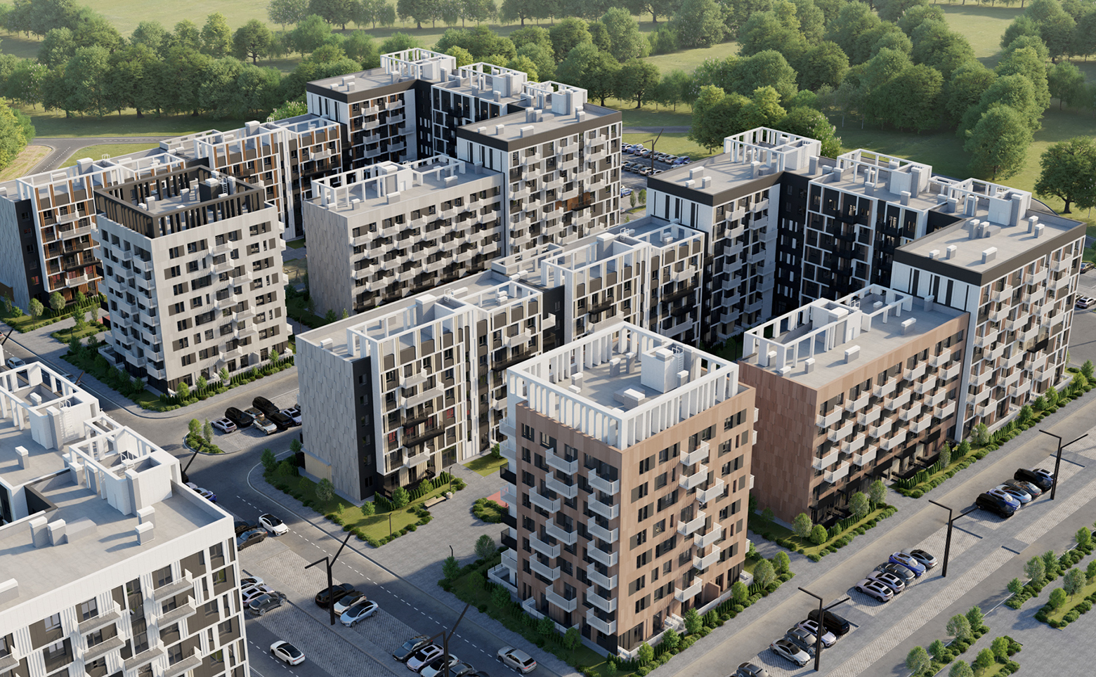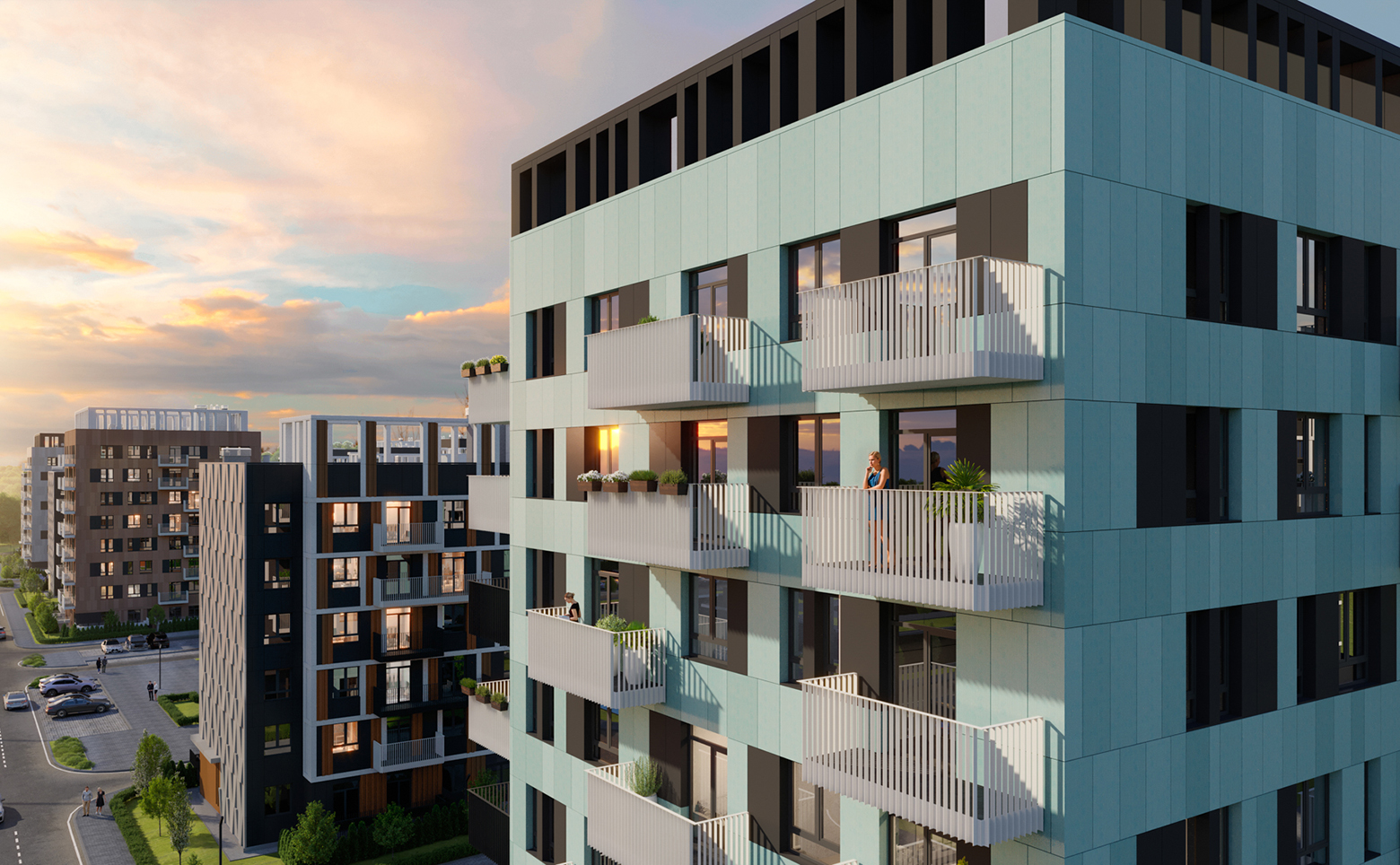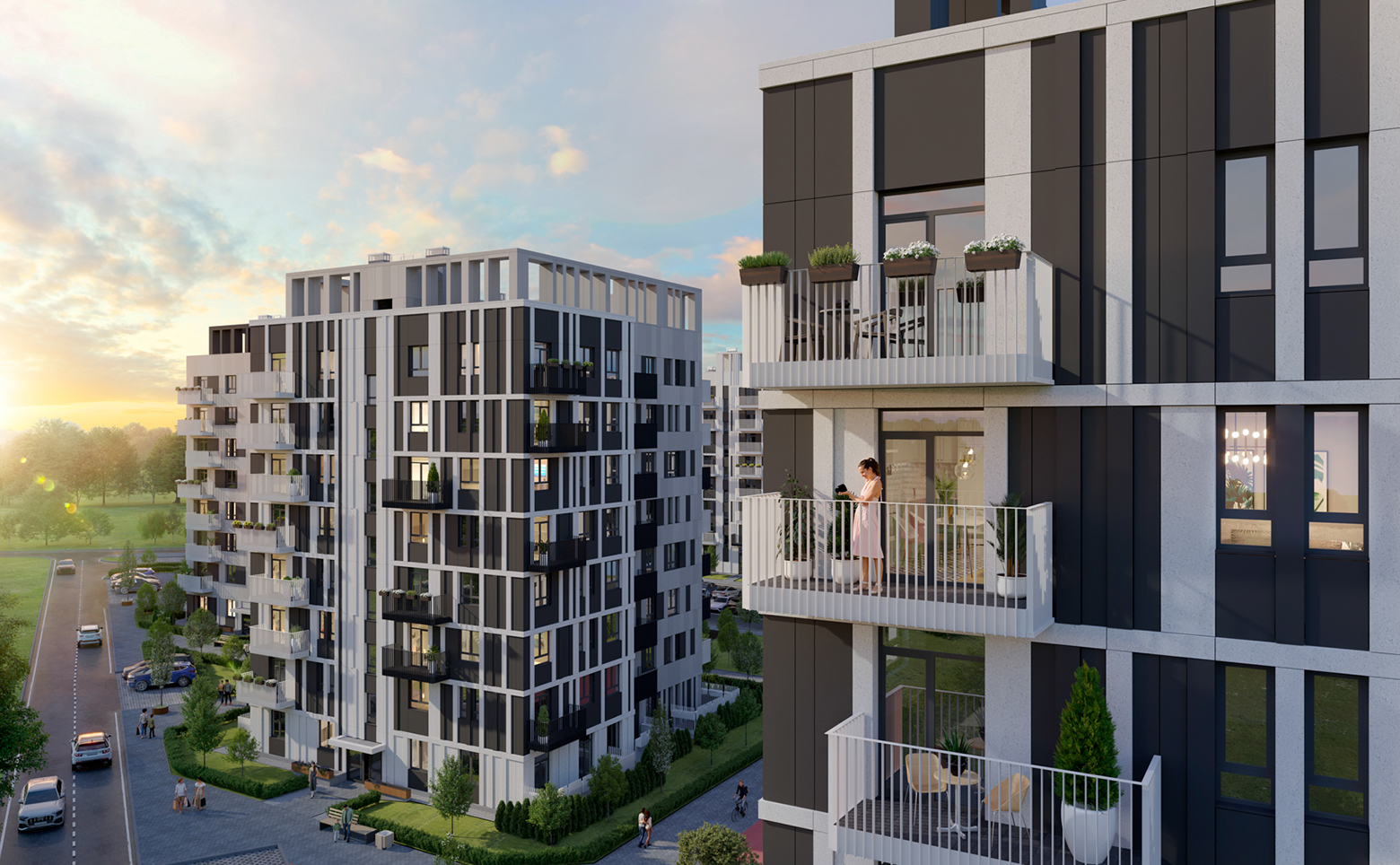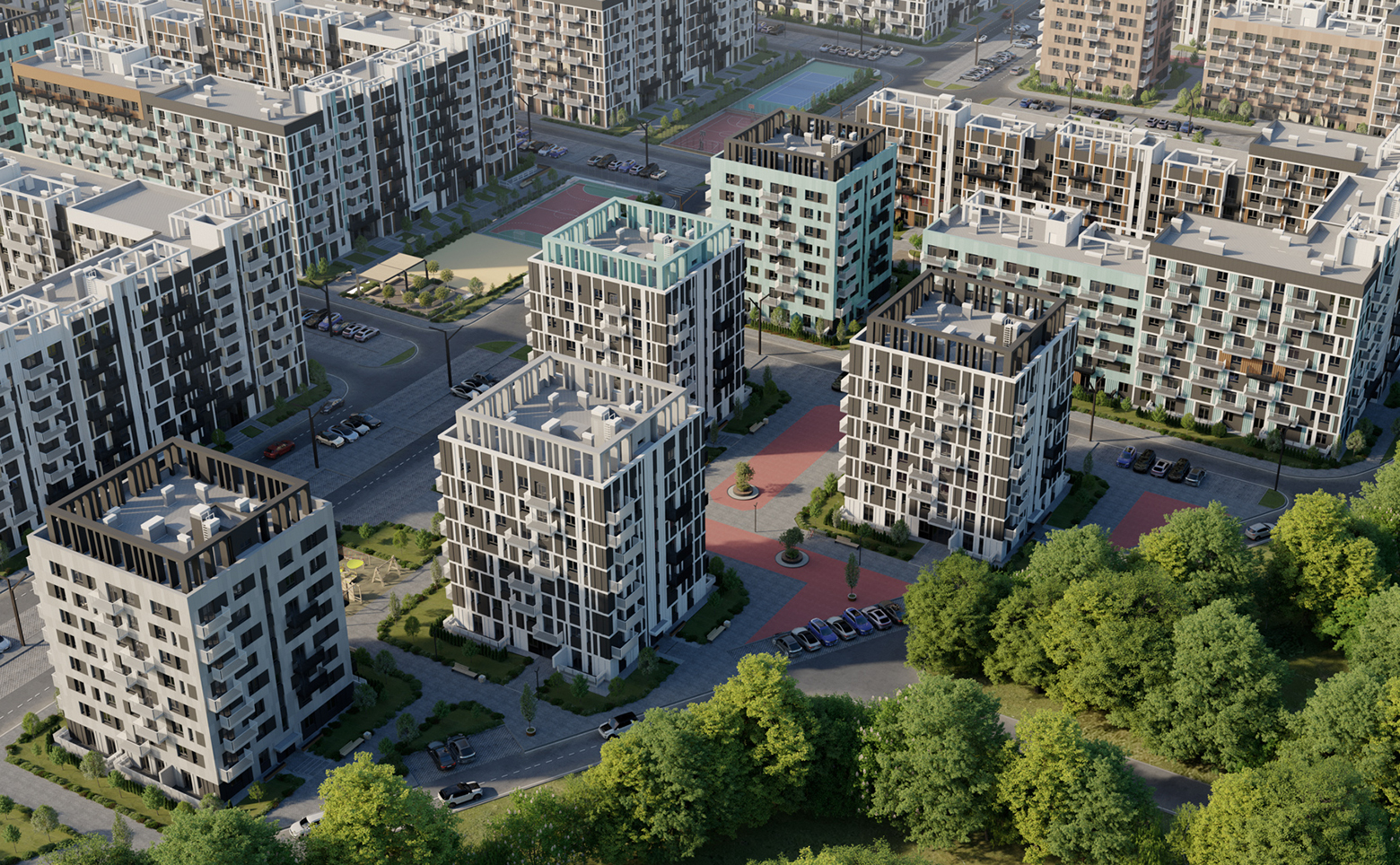 Внутреннее пространство комплекса благоустроено и свободно от автомобилей. Предусмотрены велодорожки, детские и спортивные площадки, зоны отдыха с перголами, колясочные и тактильные тропы для прогулок. Придомовая территория освещена, установлены зарядные станции для электромобилей. Для жителей обустроены грядки добрососедства для выращивания растений. Средняя этажность и отсутствие высотной застройки создают приватную атмосферу в окружении зелени.