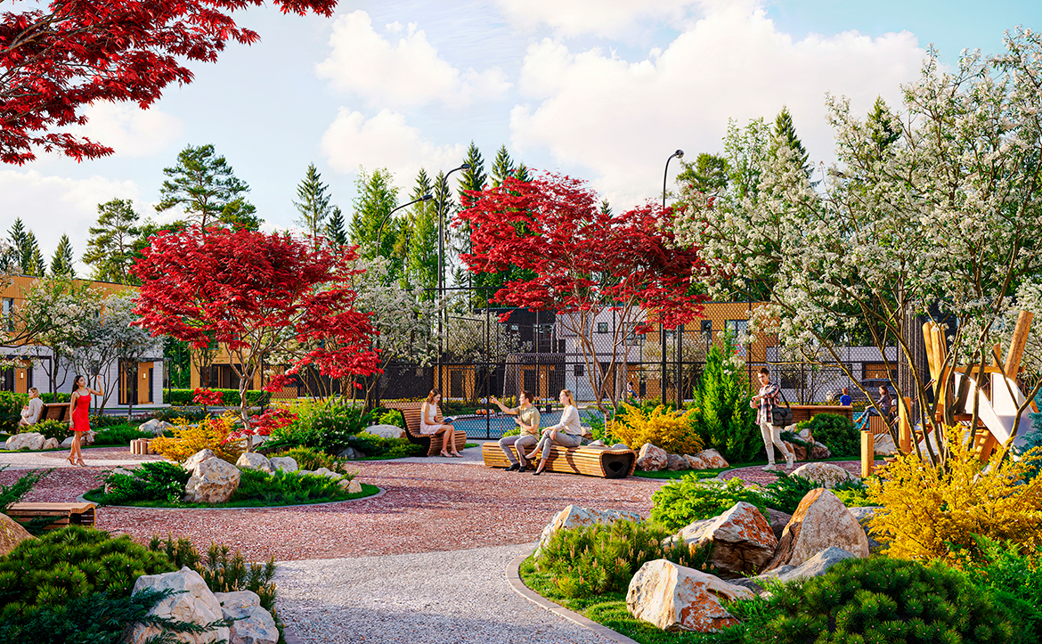 К участкам в поселке подведены все необходимые коммуникации: центральное водоснабжение, газопровод и канализация, а также электричество мощностью до 15 кВт и оптоволоконный интернет. На территории обустроена прогулочная аллея с велодорожками, японским садом, зонами отдыха и площадками для спорта и детских игр. Предусмотрены закрытые велопарковки и мини-парк с прудом, сухим фонтаном, шезлонгами и площадкой для выгула собак.