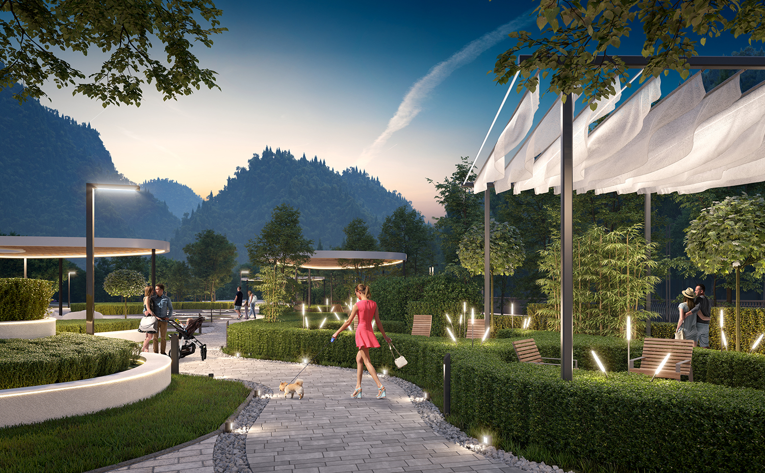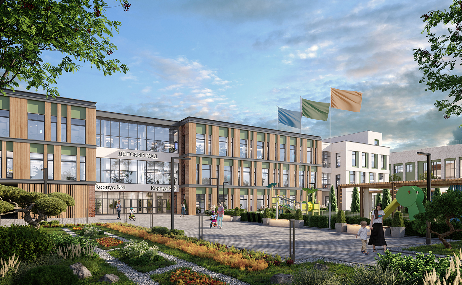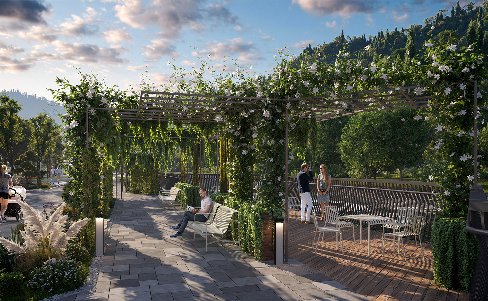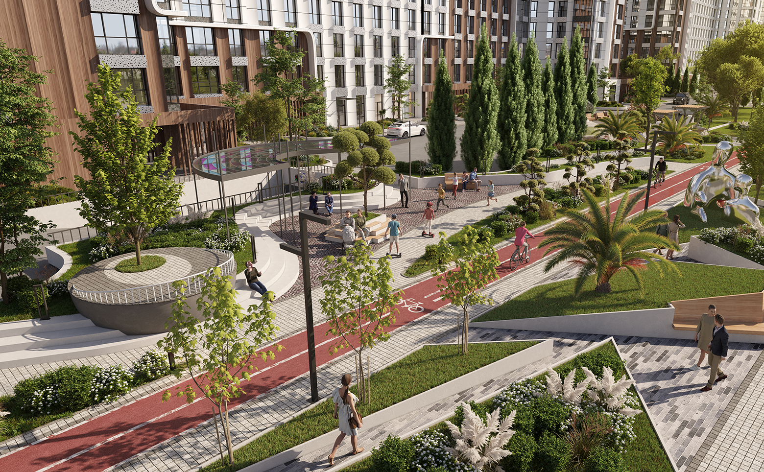 На закрытой территории комплекса выполнен ландшафтный дизайн, установлены безопасные детские площадки для детей всех возрастов, места для отдыха, зоны барбекю с беседками, спортивные площадки, установлен открытый бассейн. На территории также оборудована своя набережная протяженностью в 1,2км. Для владельцев автомобилей предусмотрен отдельный многоуровневый паркинг.