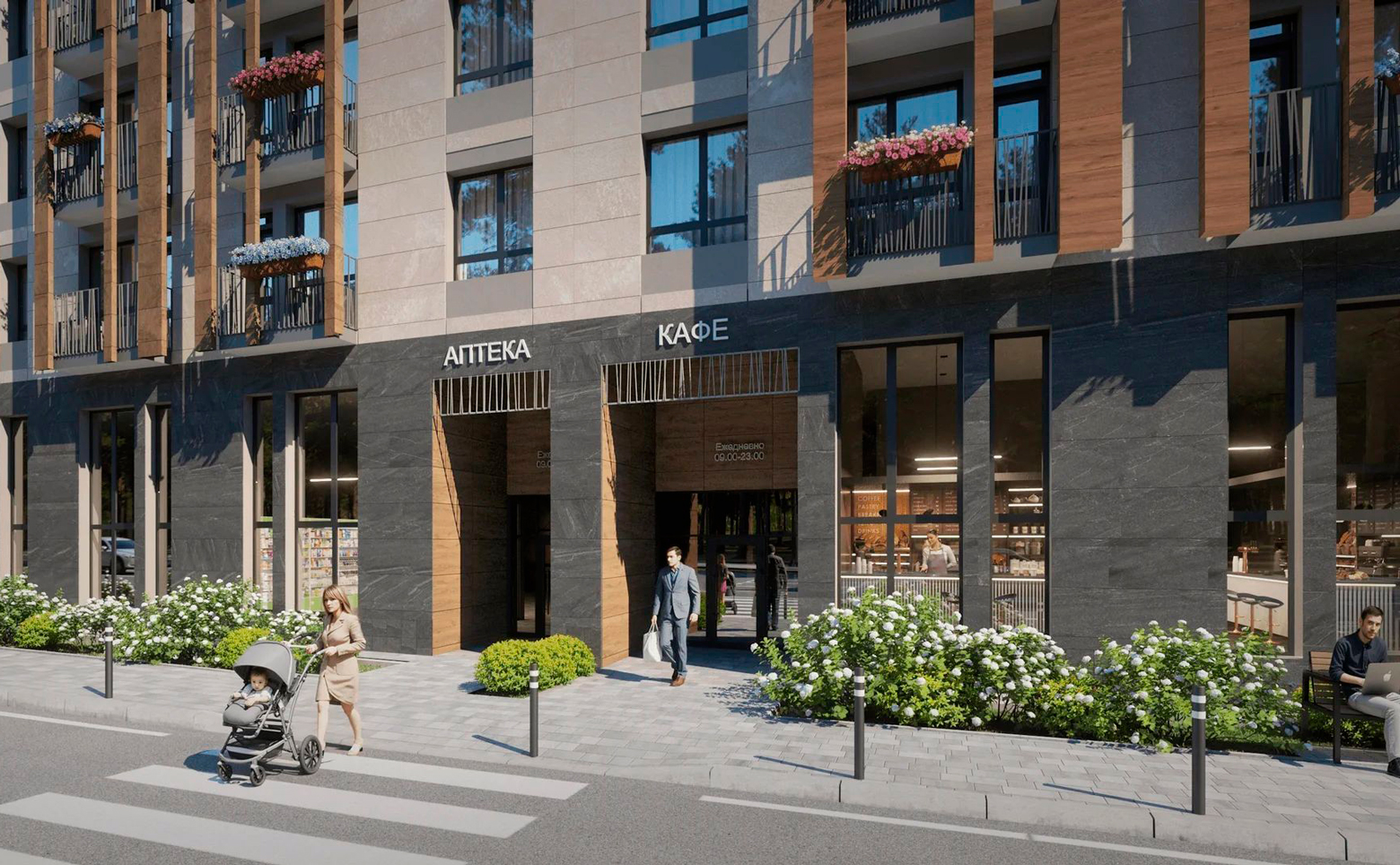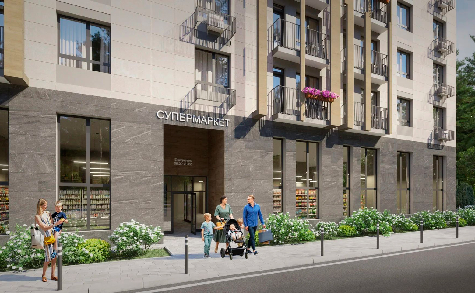 На первых этажах комплекса представлена обширная инфраструктура: детский сад, супермаркет, аптека, семейное кафе и пункты выдачи маркетплейсов. Закрытая территория проекта отличается продуманным ландшафтным дизайном и большим количеством рекреационных зон. На территории предусмотрены игровые зоны для детей, площадки для занятий спортом и лесная гостиная с беседками для отдыха. В проекте расположены гостевая парковка с зарядками для электромобилей и паркинг для жильцов. В приложении по управлению домом есть возможность открывать входные двери, управлять домофоном и просматривать видеокамеры комплекса.