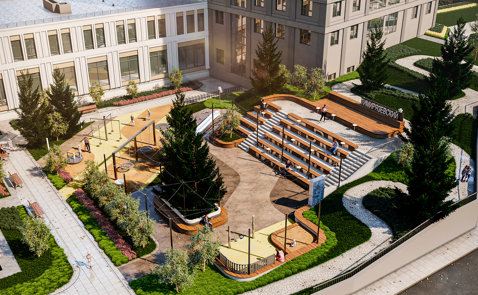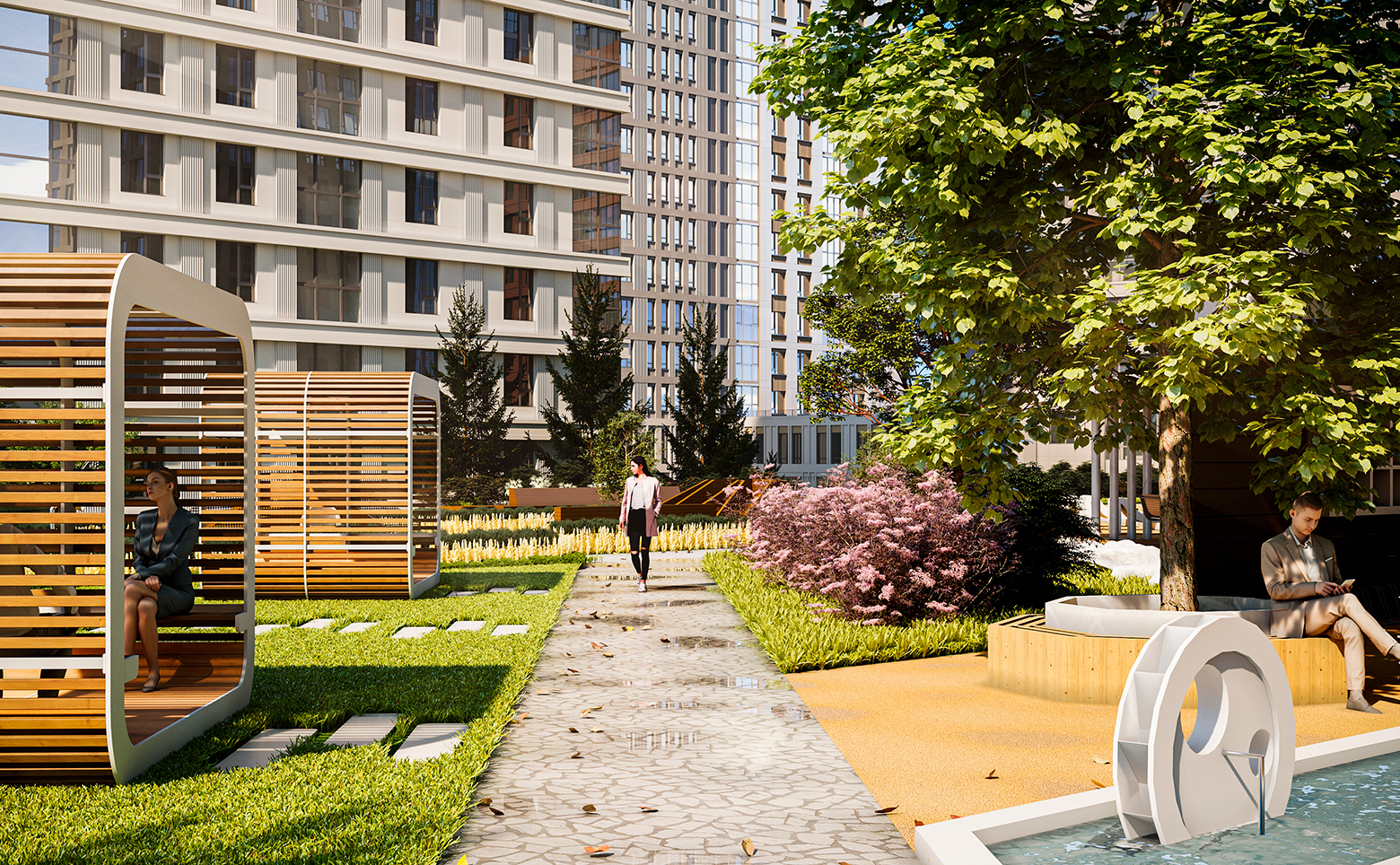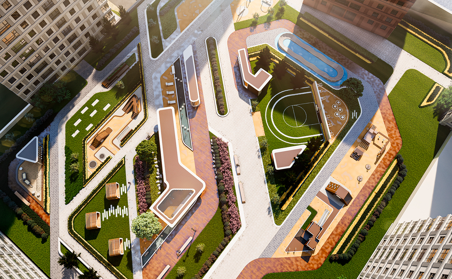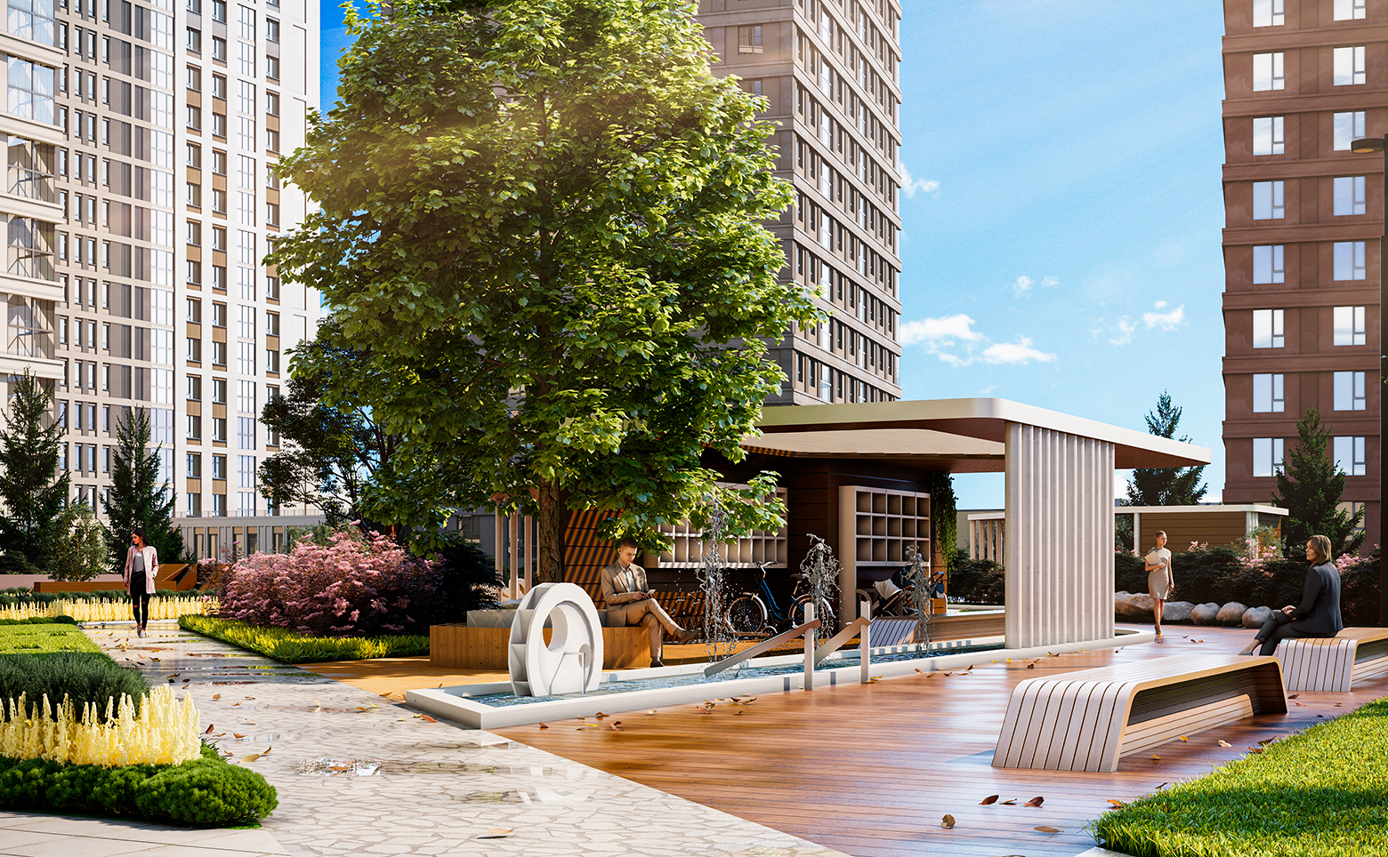 На территории жилого комплекса обустроен двор без доступа машин, размещены детские и спортивные площадки, а также велодорожка. Для владельцев авто организована стоянка. На первых этажах оборудованы коммерческие помещения.