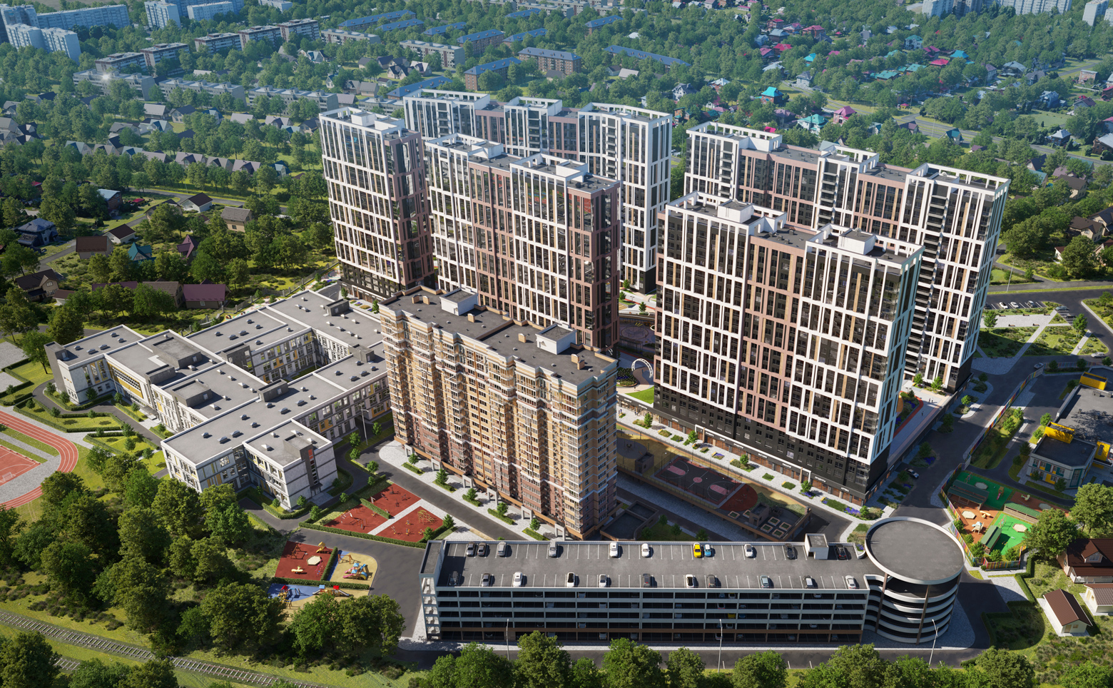 Проект, построенный по самым передовым технологиям, включает в себя 7 домов высотой от 19 до 24 этажей. В подъездах выполнена премиальная дизайнерская отделка. Входные парадные имеют два входа: со двора и улицы.