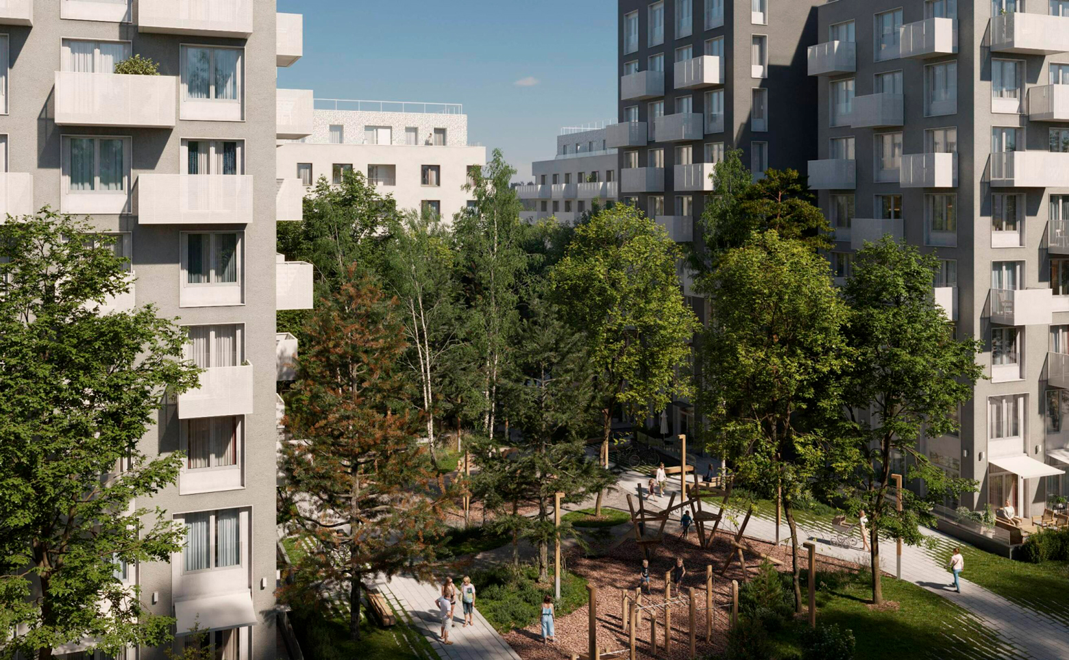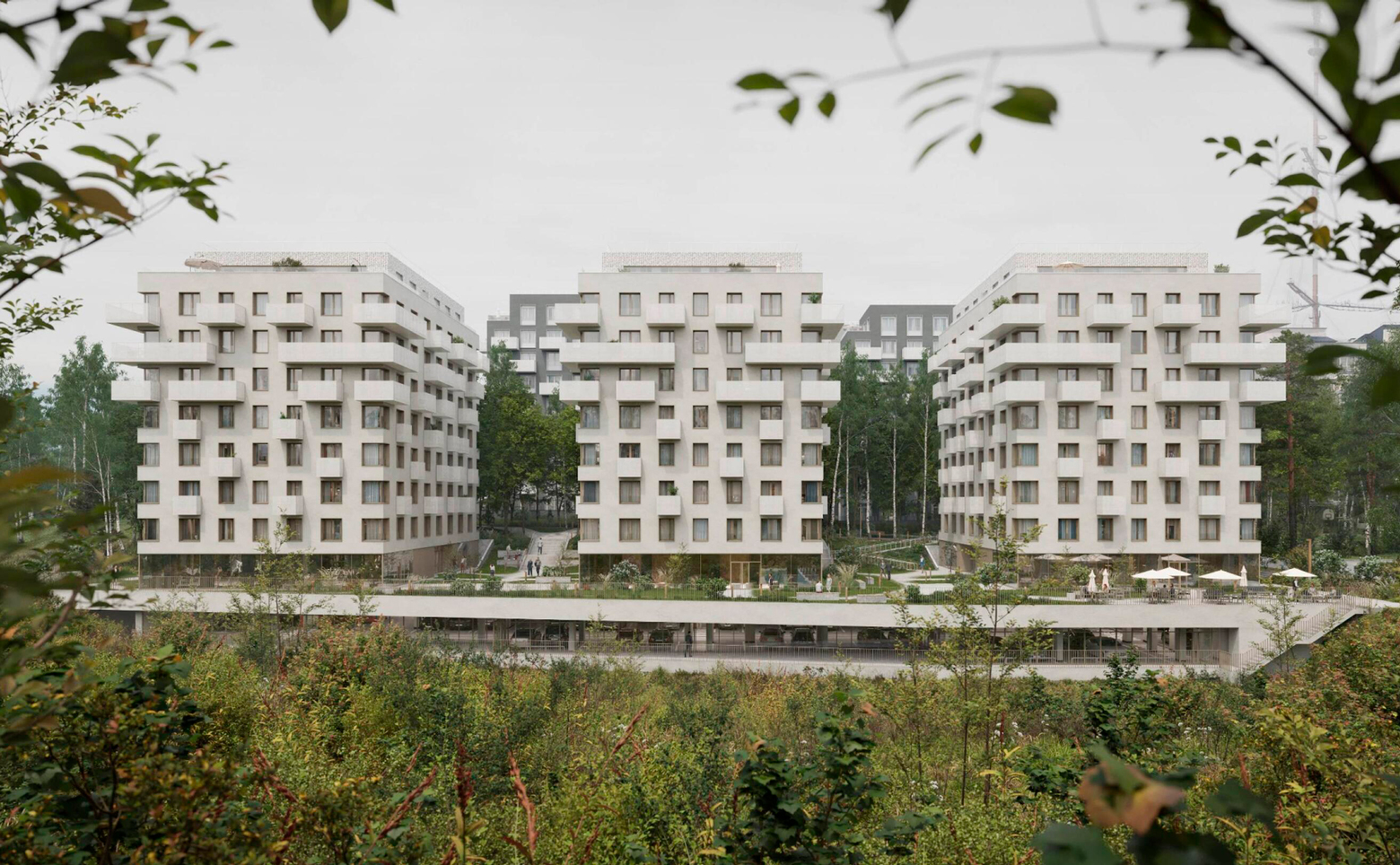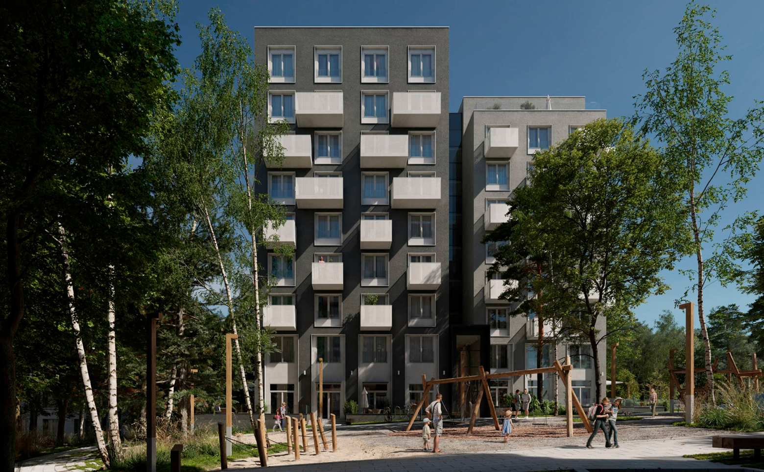 В проекте предлагаются студии и квартиры с 1–4 комнатами. Доступны форматы с мастер-спальнями, постирочными и рабочими кабинетами, а также пентхаусы с просторными террасами и дуплексы. Высота потолков варьируется от 2,7 до 3 м. Установлены стандартные окна с видами на лес в некоторых опциях. Отделка — подчистовая: стены оштукатурены, выполнена стяжка пола, разведена электропроводка с розетками и выключателями, вмонтированы радиаторы отопления, входная дверь и счетчики для горячего и холодного водоснабжения.