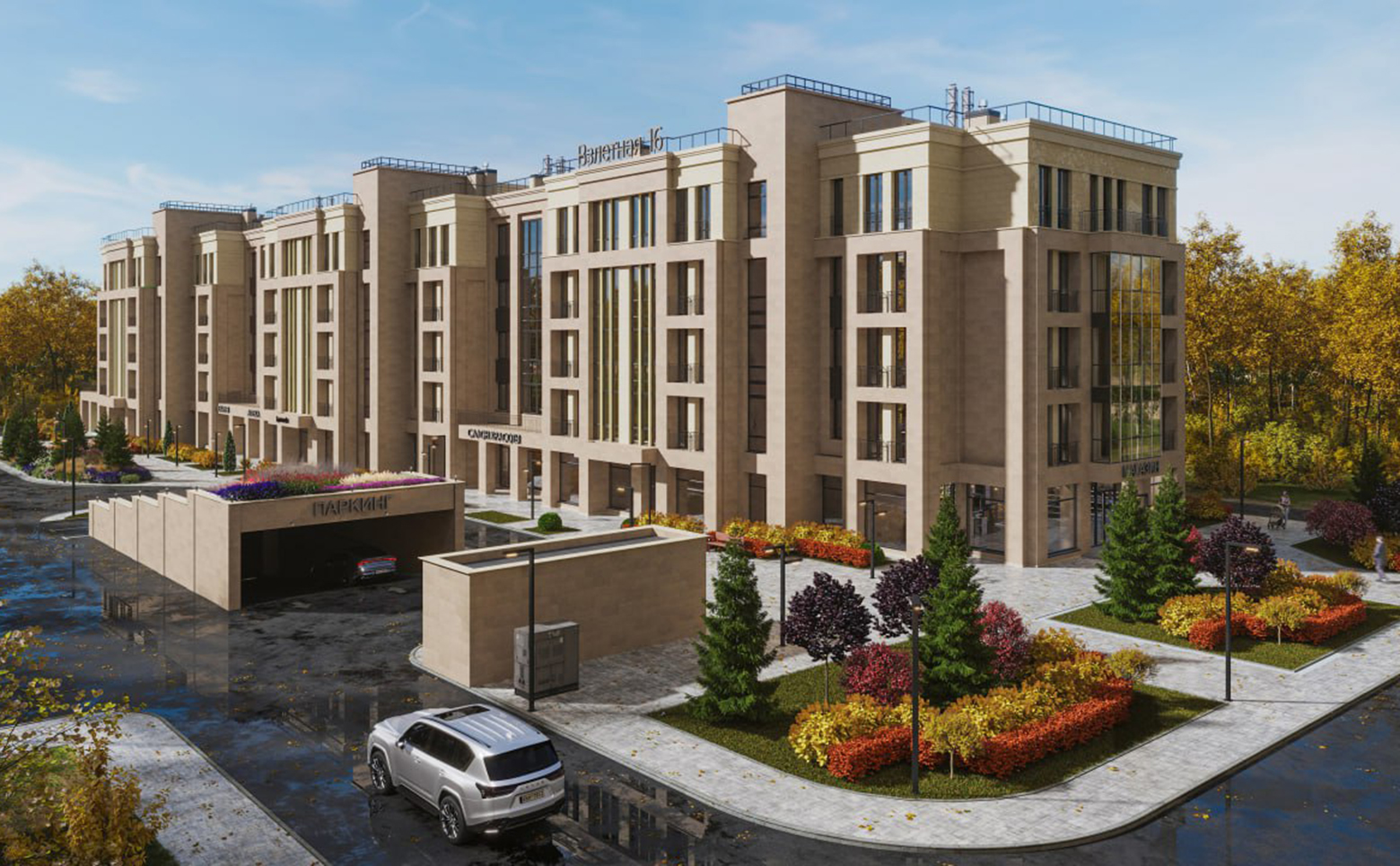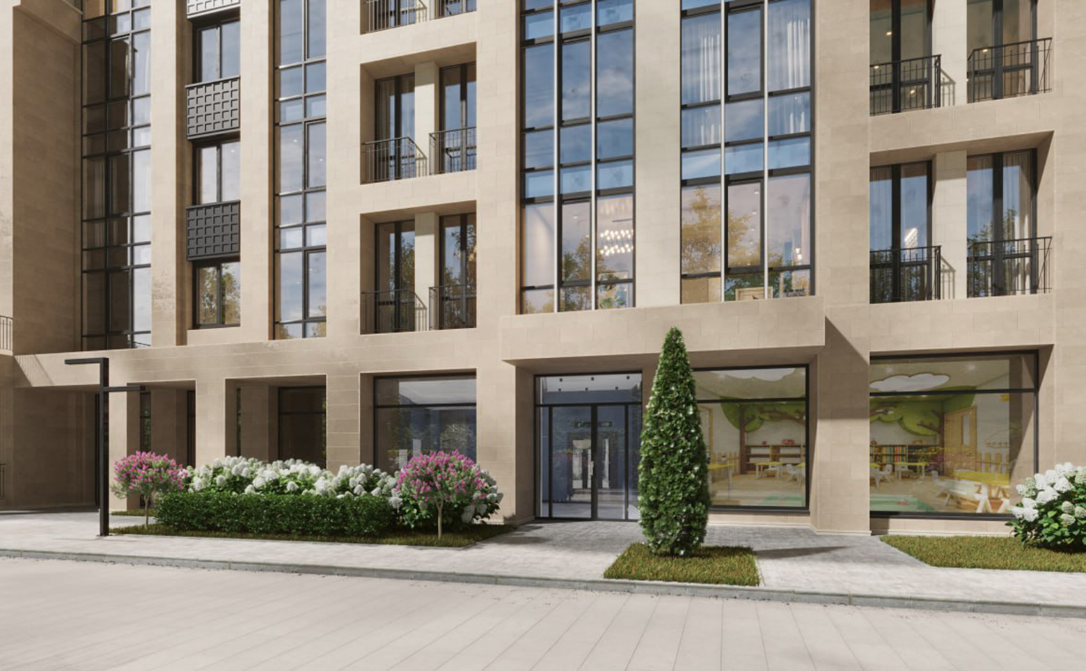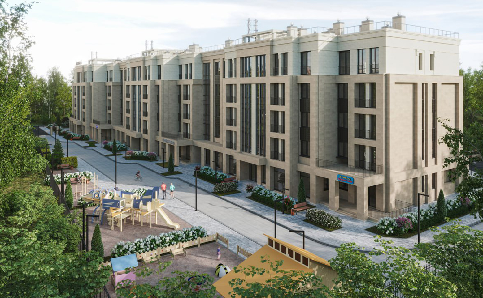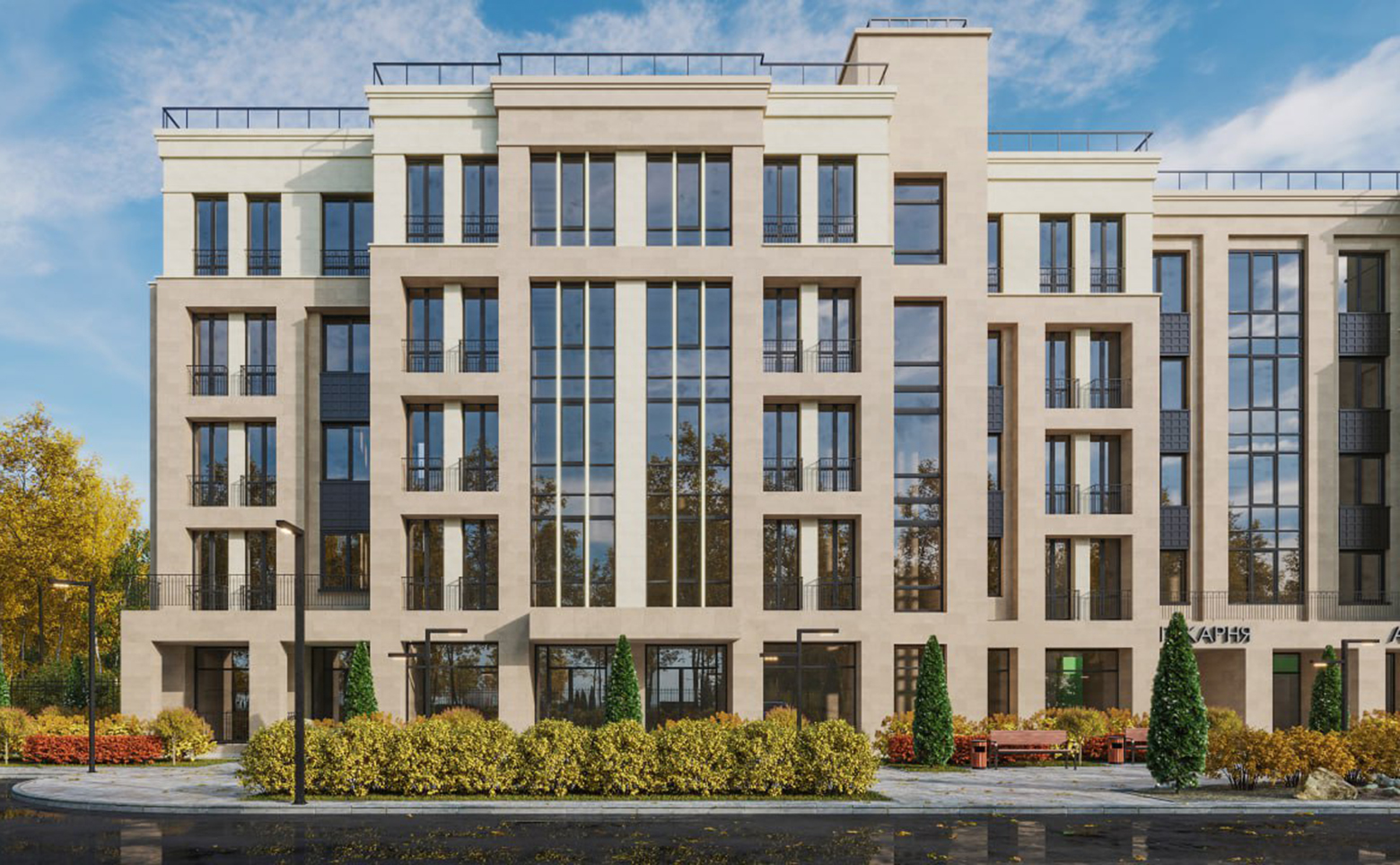 Проект представляет собой малоэтажное здание высотой 5 этажей, выполненное по кирпично-монолитной технологии. Фасады облицованы керамогранитом в оттенке юрского мрамора. Неоклассический стиль комплекса сочетает в себе симметричные композиции и большой объем остекления. В здании выполнена дизайнерская отделка входных групп — предусмотрены колясочные, зона для хранения велосипедов, почтовая и кладовая зоны.