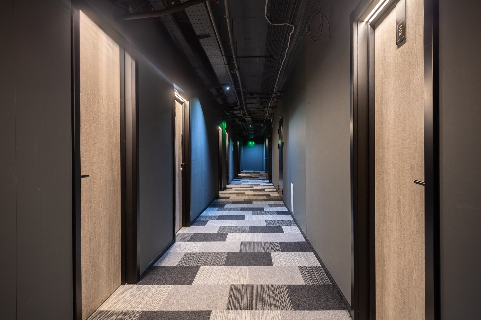 На первом этаже комплекса размещена зона ресепшен, гастромаркет, рестораны, бары и коммерческие помещения. Также предусмотрены фитнес-клуб и коворкинг с конференц-залом и трансформируемым кинотеатром. Во внутреннем дворе спроектированы 2 благоустроенных атриума. Для владельцев авто оборудован подземный паркинг. Безопасность обеспечивается круглосуточной охраной и видеонаблюдением.