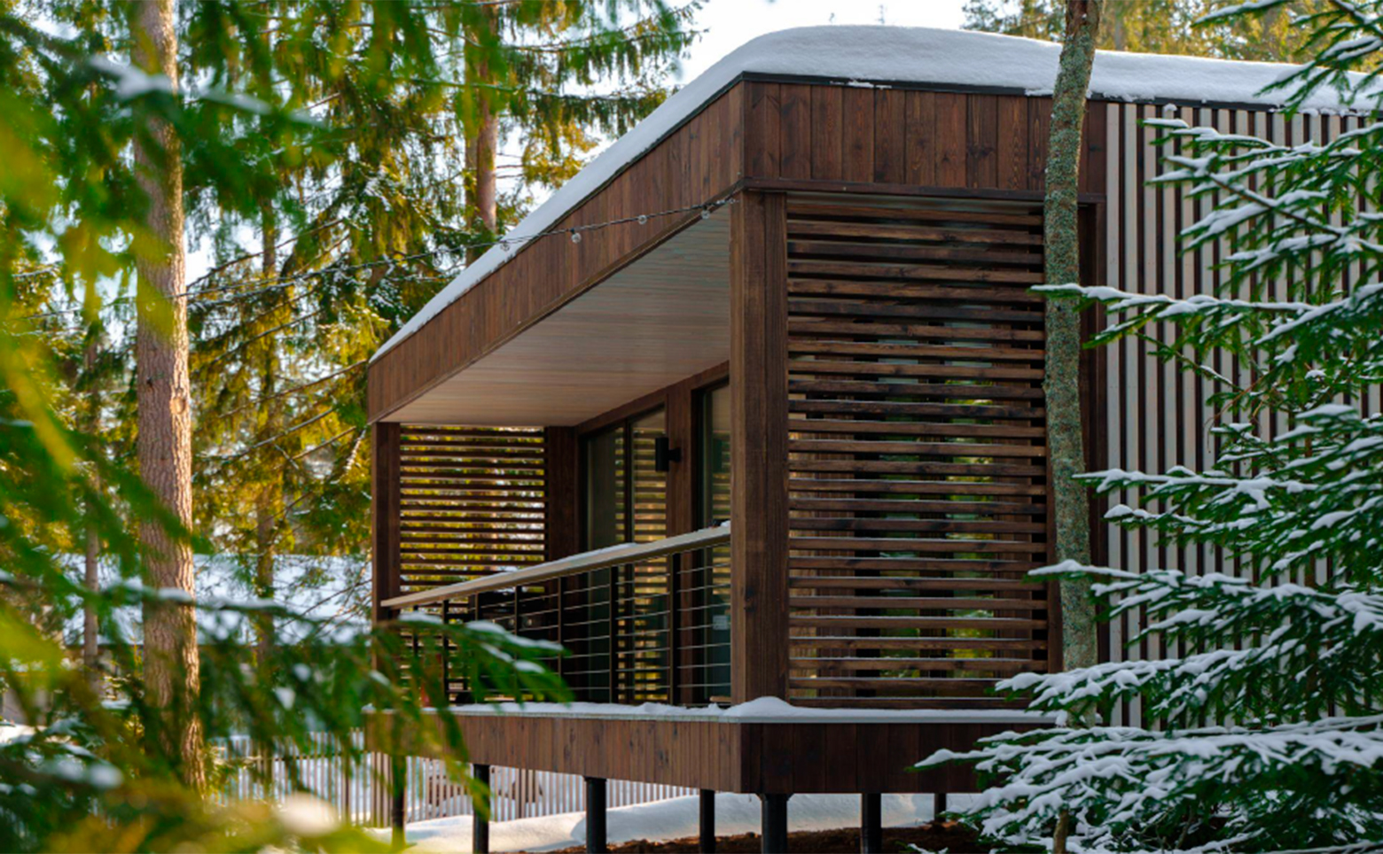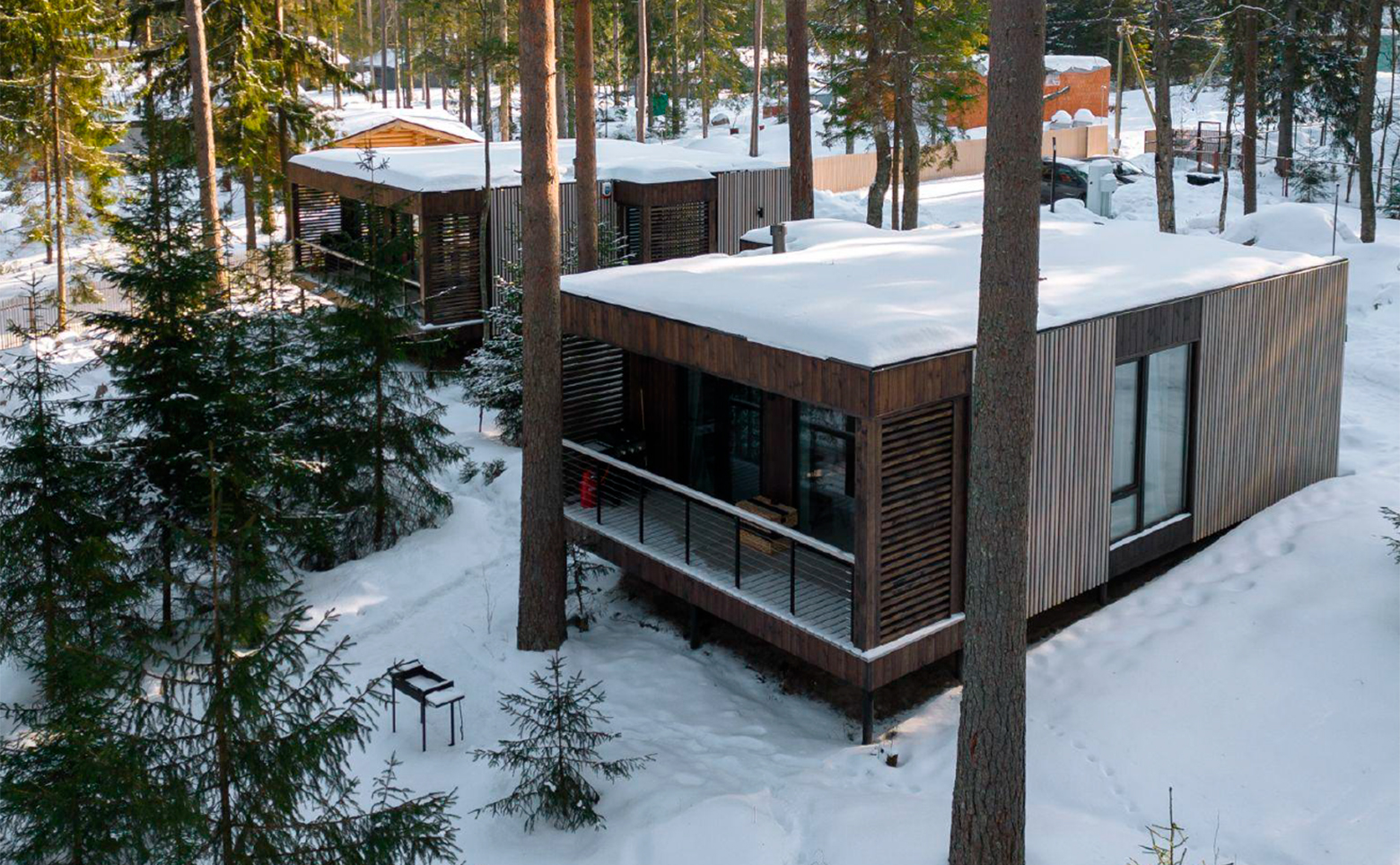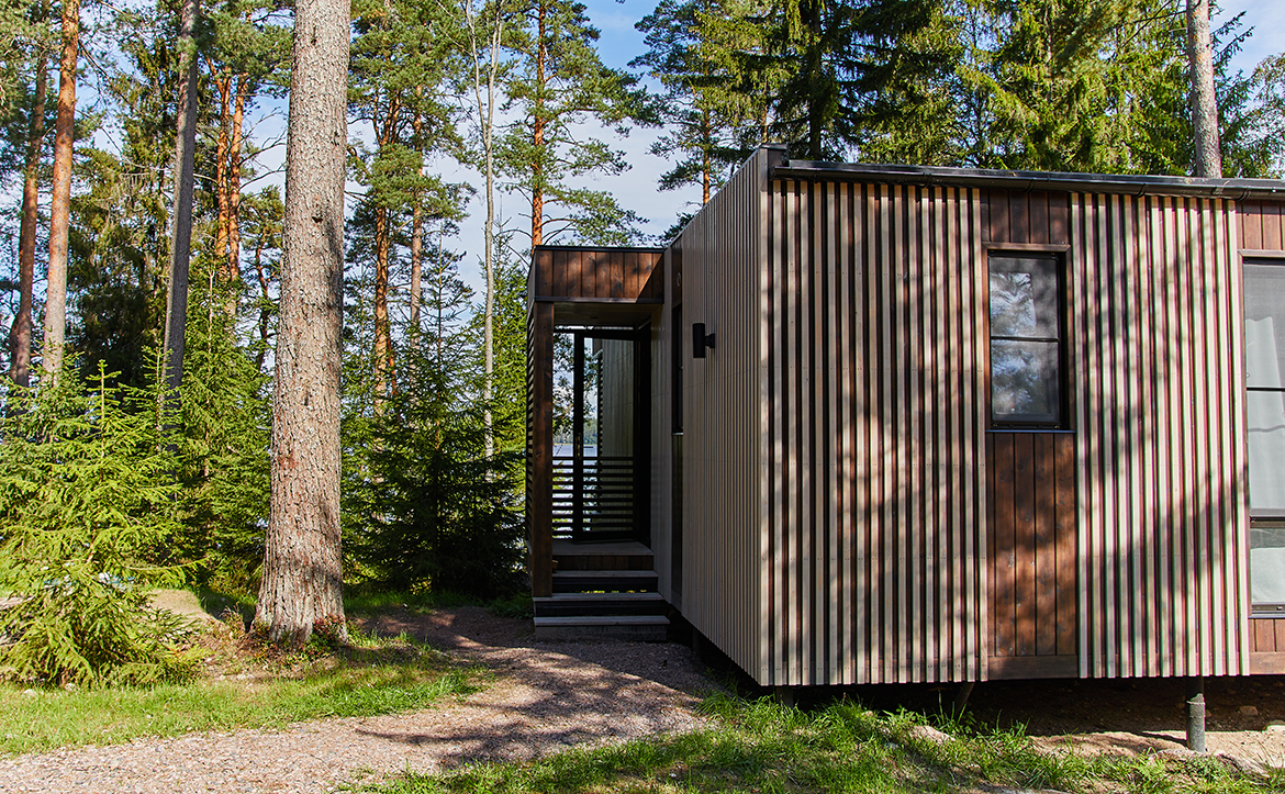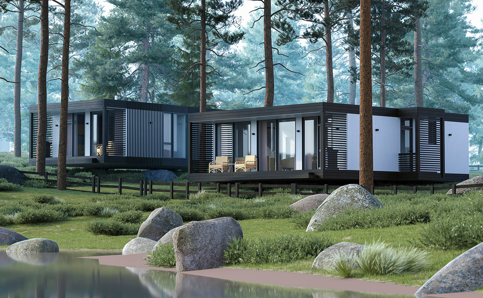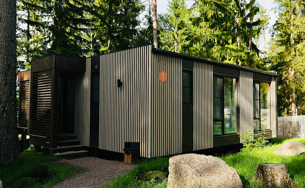 Проект представляет собой жилые модули с участками и видом на хвойный лес и воду. В каждом доме есть все для длительного пребывания: стиральная и посудомоечная машины, рабочий стол, шкафы, кровати. Для безопасности доступ осуществляется с помощью электронного замка, имеются датчики дыма, протечки и объема, а умная система позволяет управлять освещением, карнизом и звуком. Лоты сдаются с панорамными окнами, комплектацией под ключ и зоной барбекю на крытой террасе.