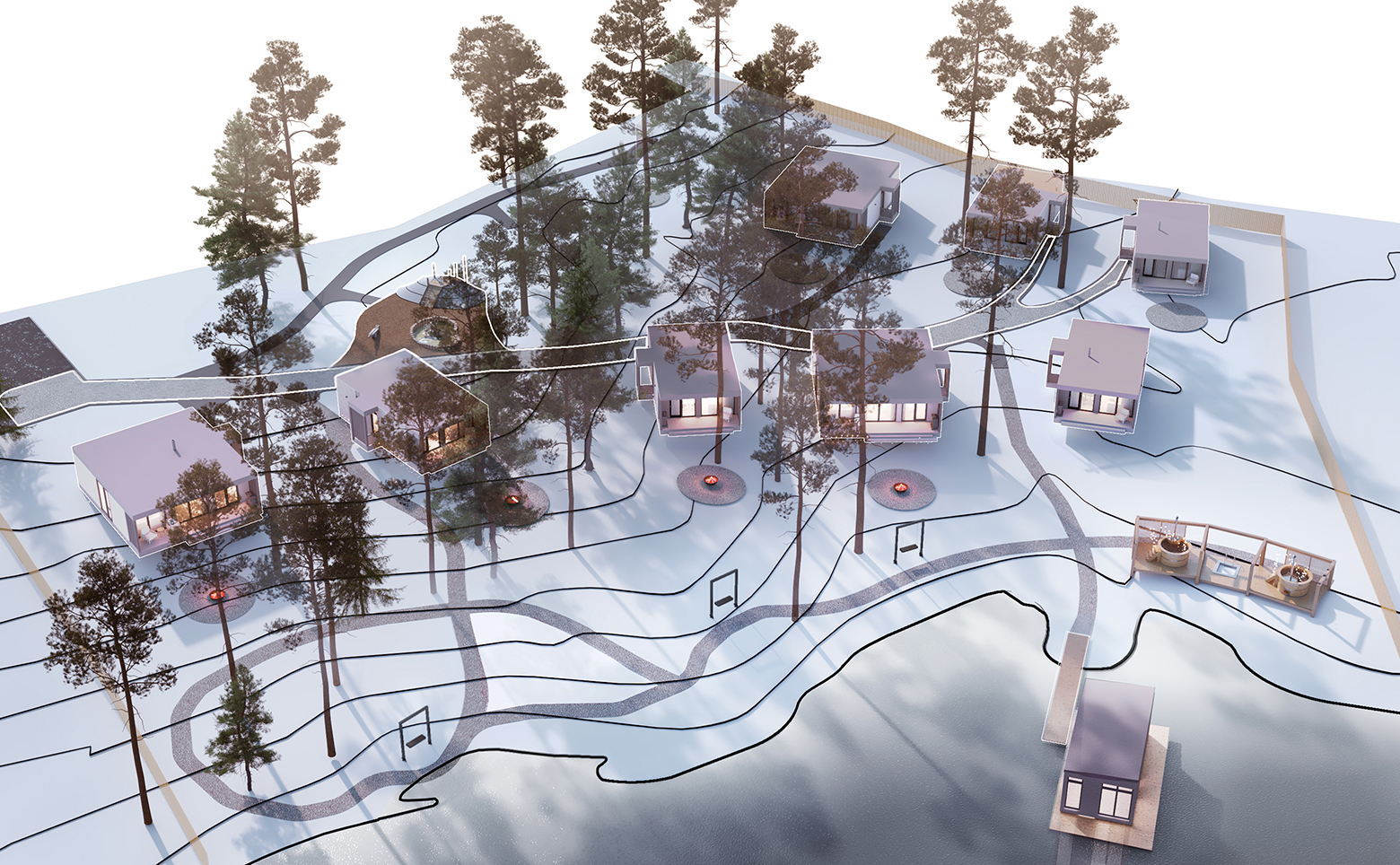 Территория загородного апарт-отеля закрыта, доступ осуществляется через охраняемую въездную группу с КПП. Проектом предусмотрены баня и банные чаны с видом на озеро, собственный пирс, качели и смотровые площадки, имеются оборудованные места для прогулок и детских игр.