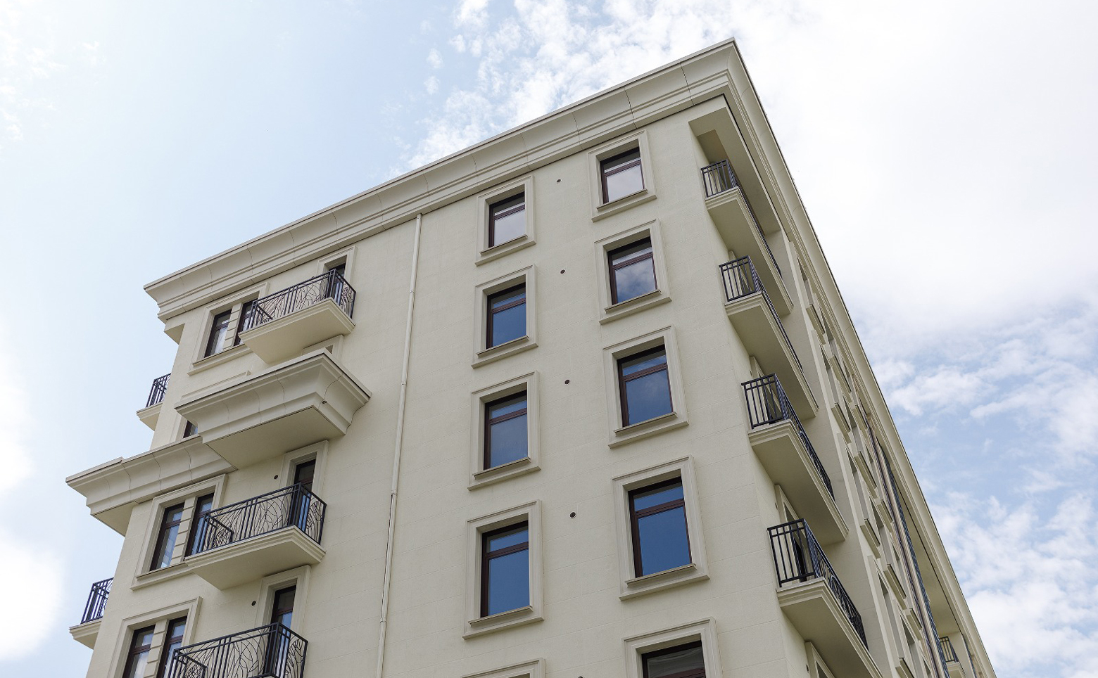 Жилой комплекс состоит из 9 корпусов переменной этажности в 5-9 этажей. Возведены по кирпично-монолитной технологии строительства с фасадами, облицованными штукатуркой. Установлены пассажирский и грузовой лифты.