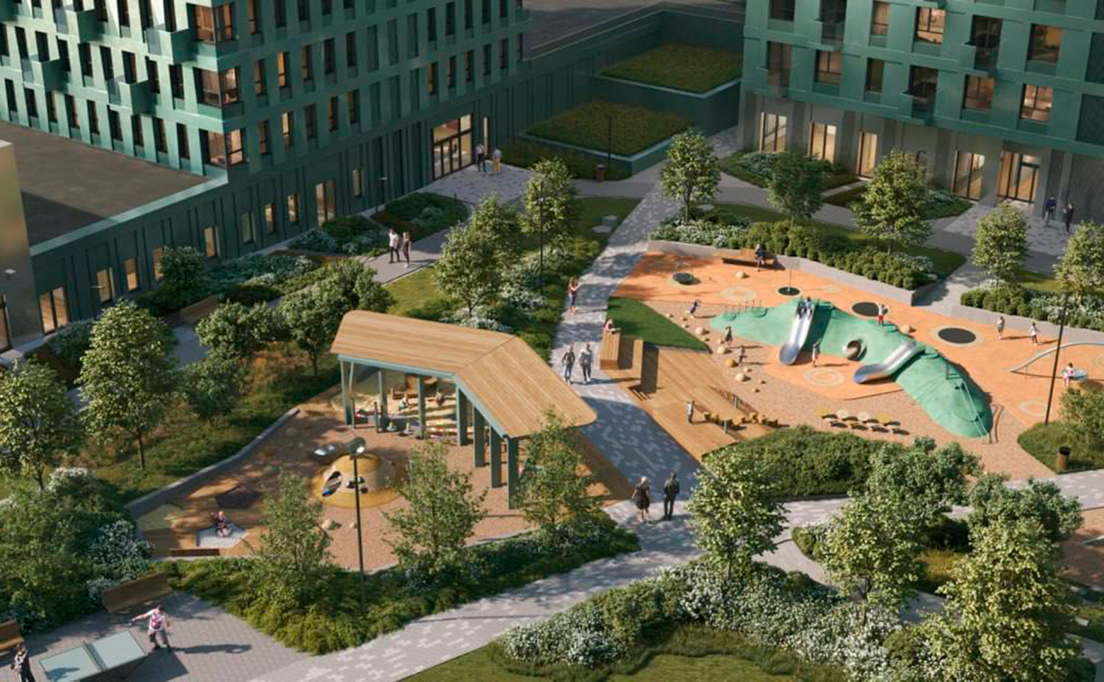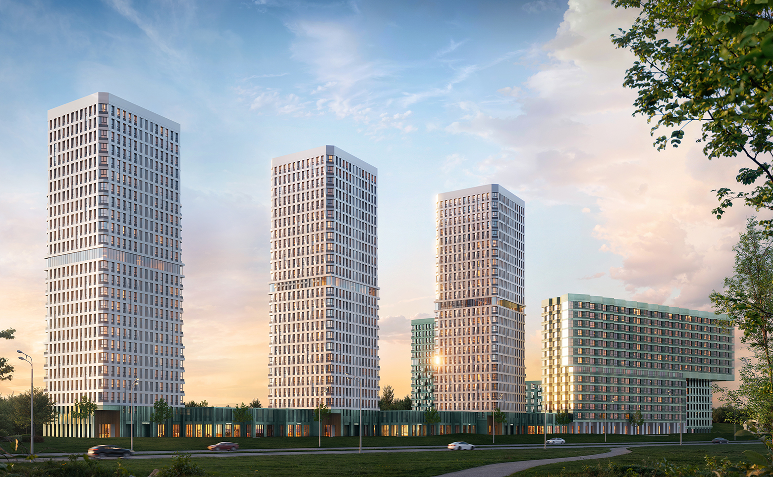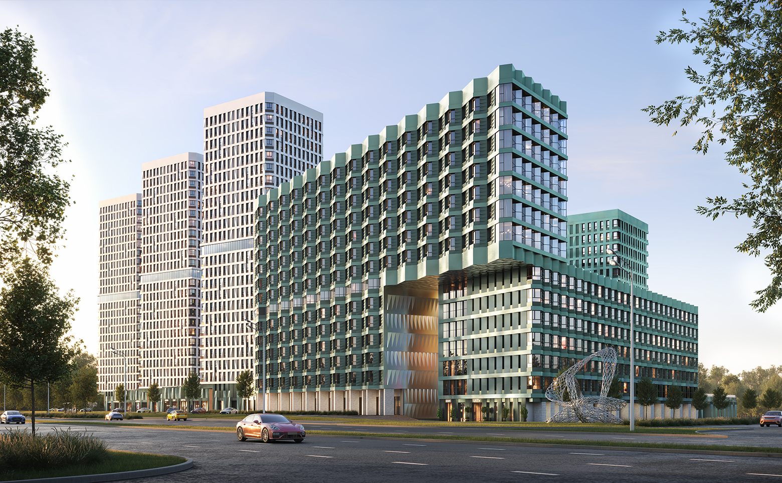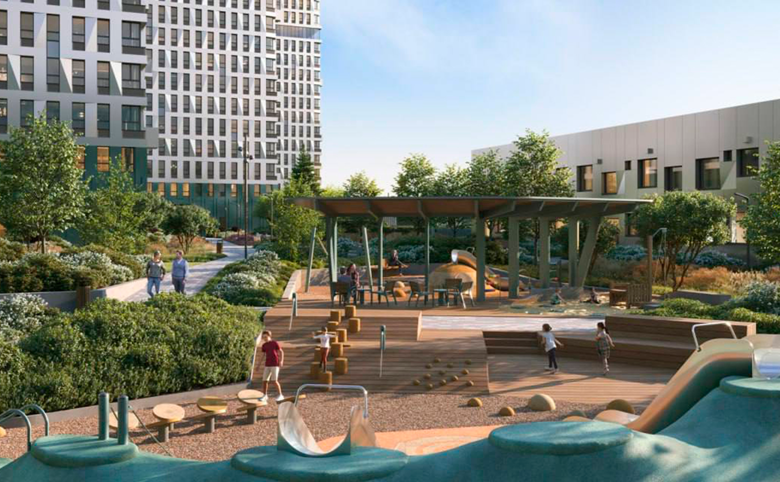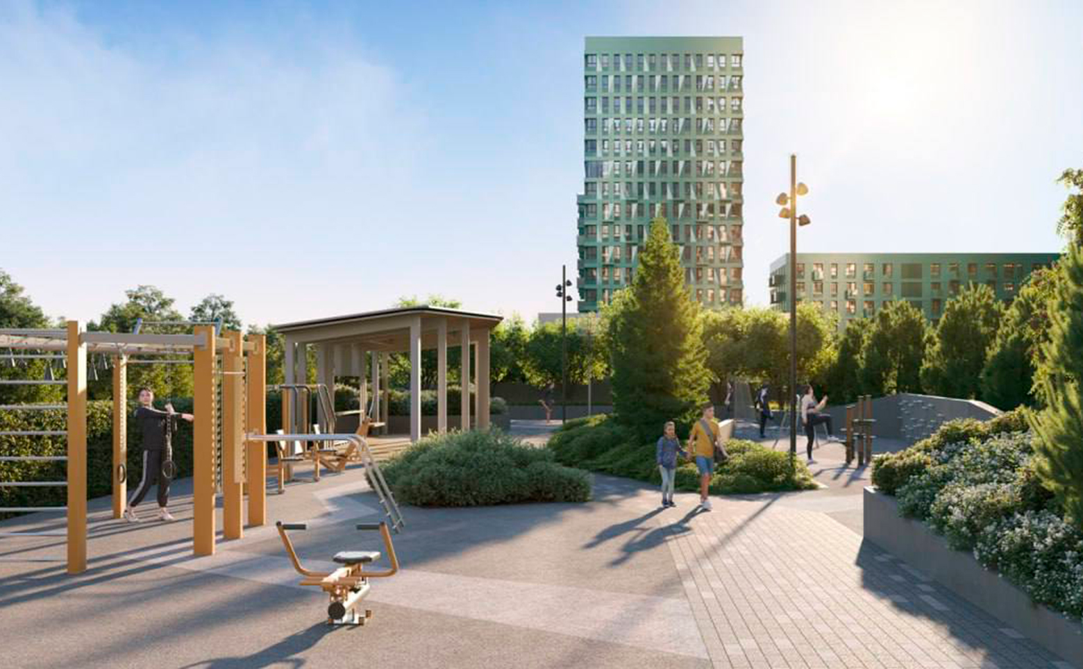 На территории комплекса организован уютный двор без машин, с зонами отдыха, зелеными насаждениями, детскими и спортивными площадками. Первые этажи отведены под коммерческие помещения, у лифтовых холлов оборудованы колясочные и велобоксы. В подземной части расположены индивидуальные кладовые и паркинг. Здесь предусмотрен собственный детский сад, а безопасность территории обеспечивается видеонаблюдением. Жителям доступны воркаут-пространства и тихие зеленые аллеи, которые отделяют двор от городских улиц.