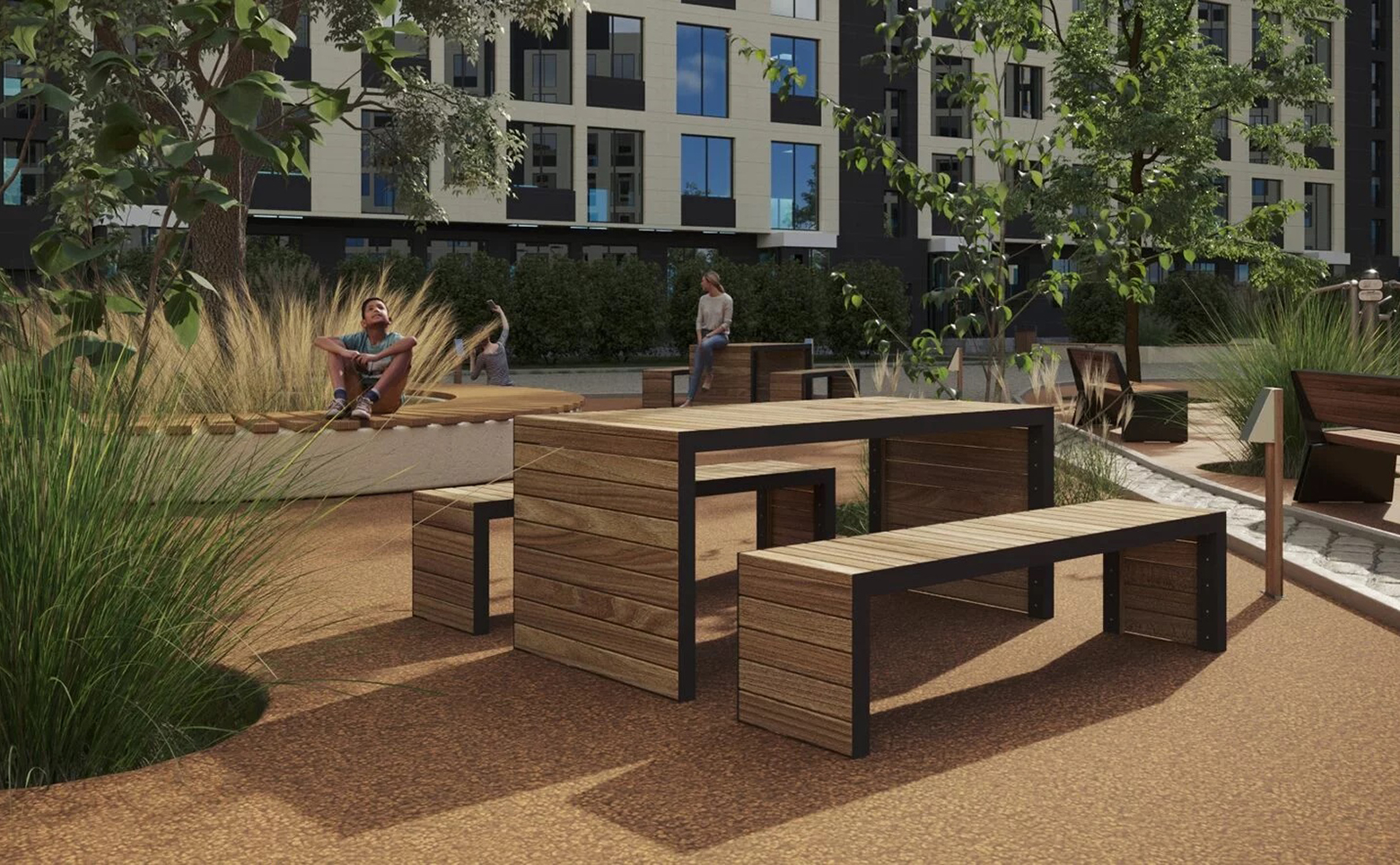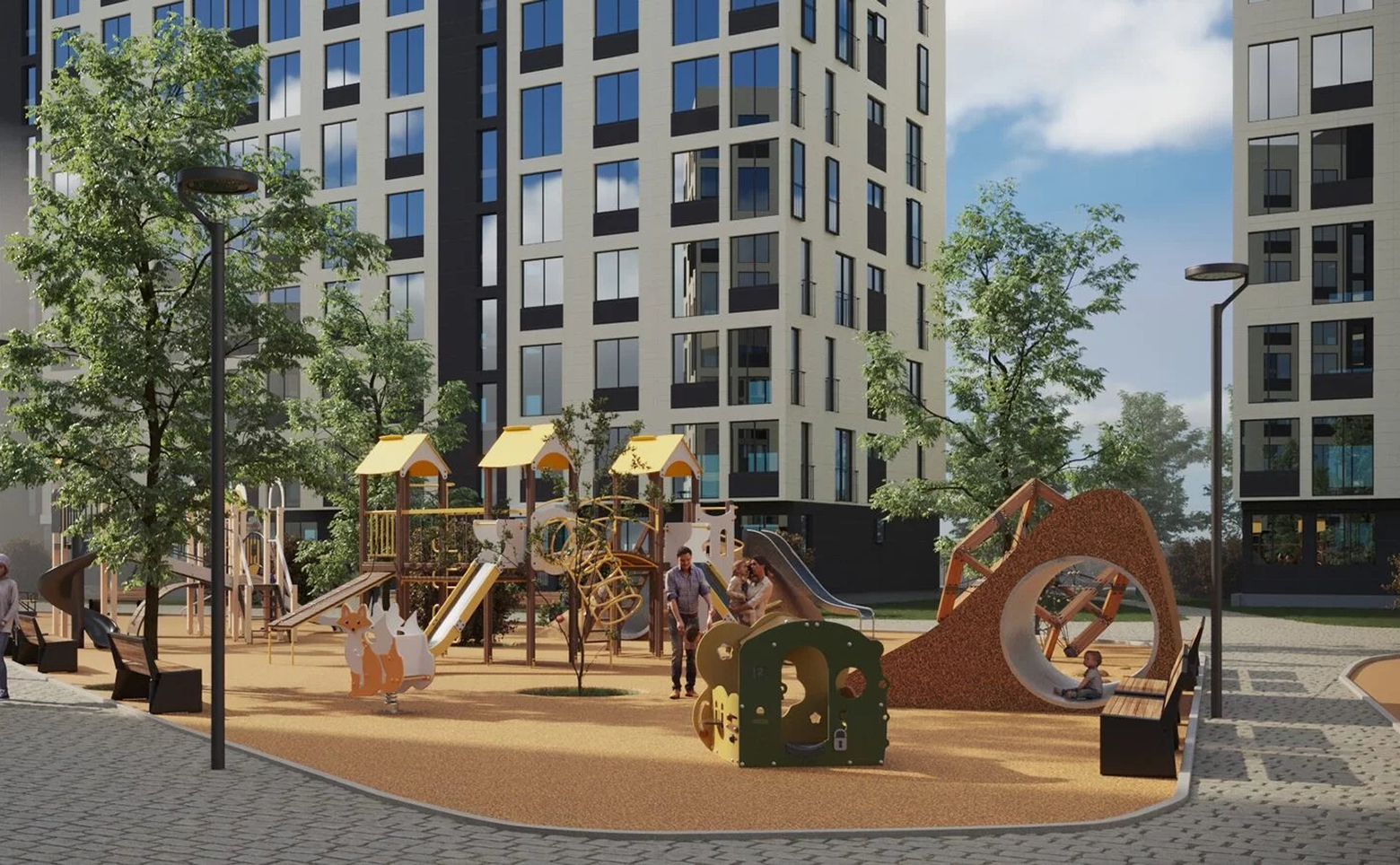 Территория комплекса огорожена от автомобилей, осуществлено зонирование территории: детские площадки для игр, зоны для занятий спортом и приготовления барбекю.